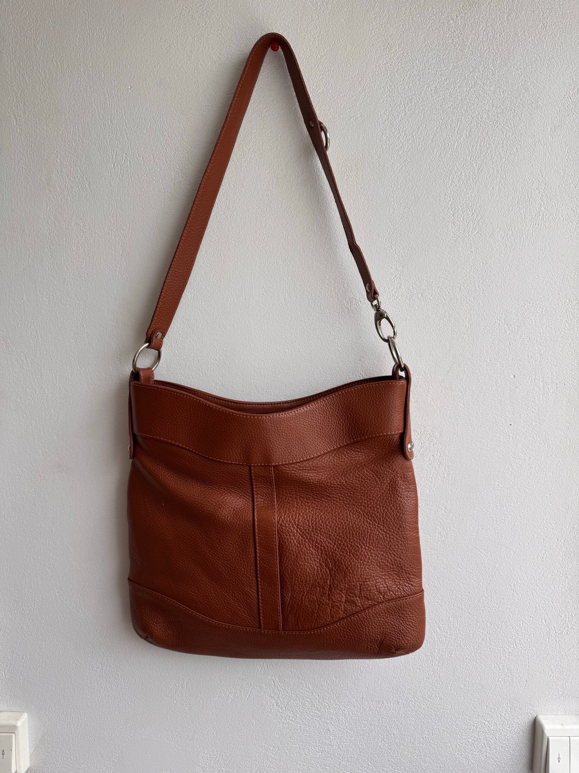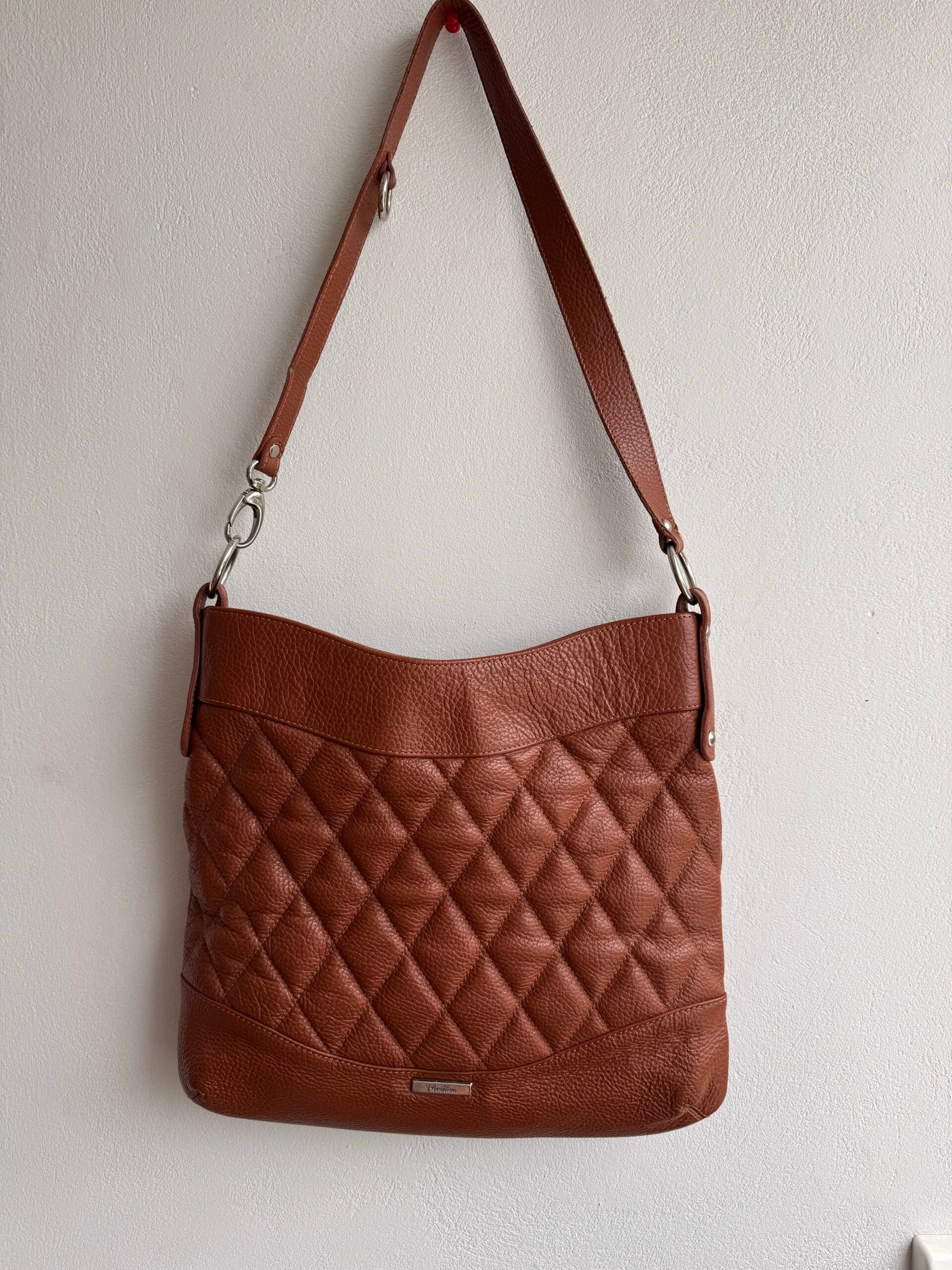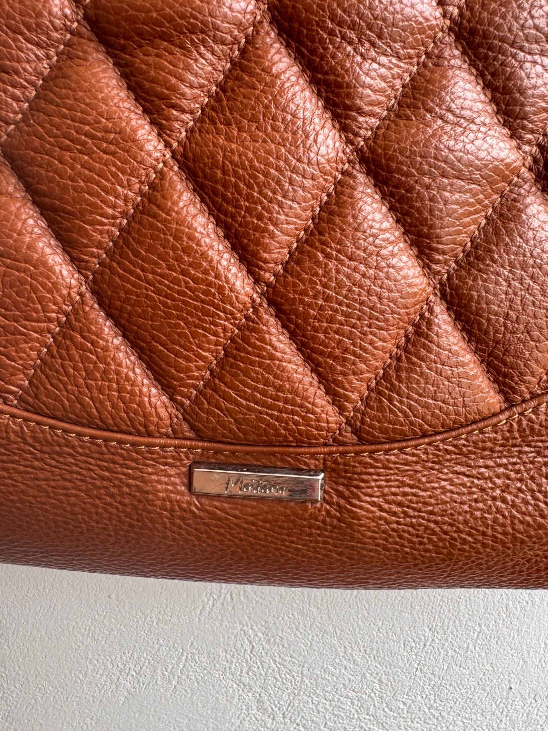 Δερμάτινη τσάντα Montana σε απόχρωση cognac με quilted υφή και ρυθμιζόμενο λουρί ώμου. Διαχρονική, κομψή και ευρύχωρη