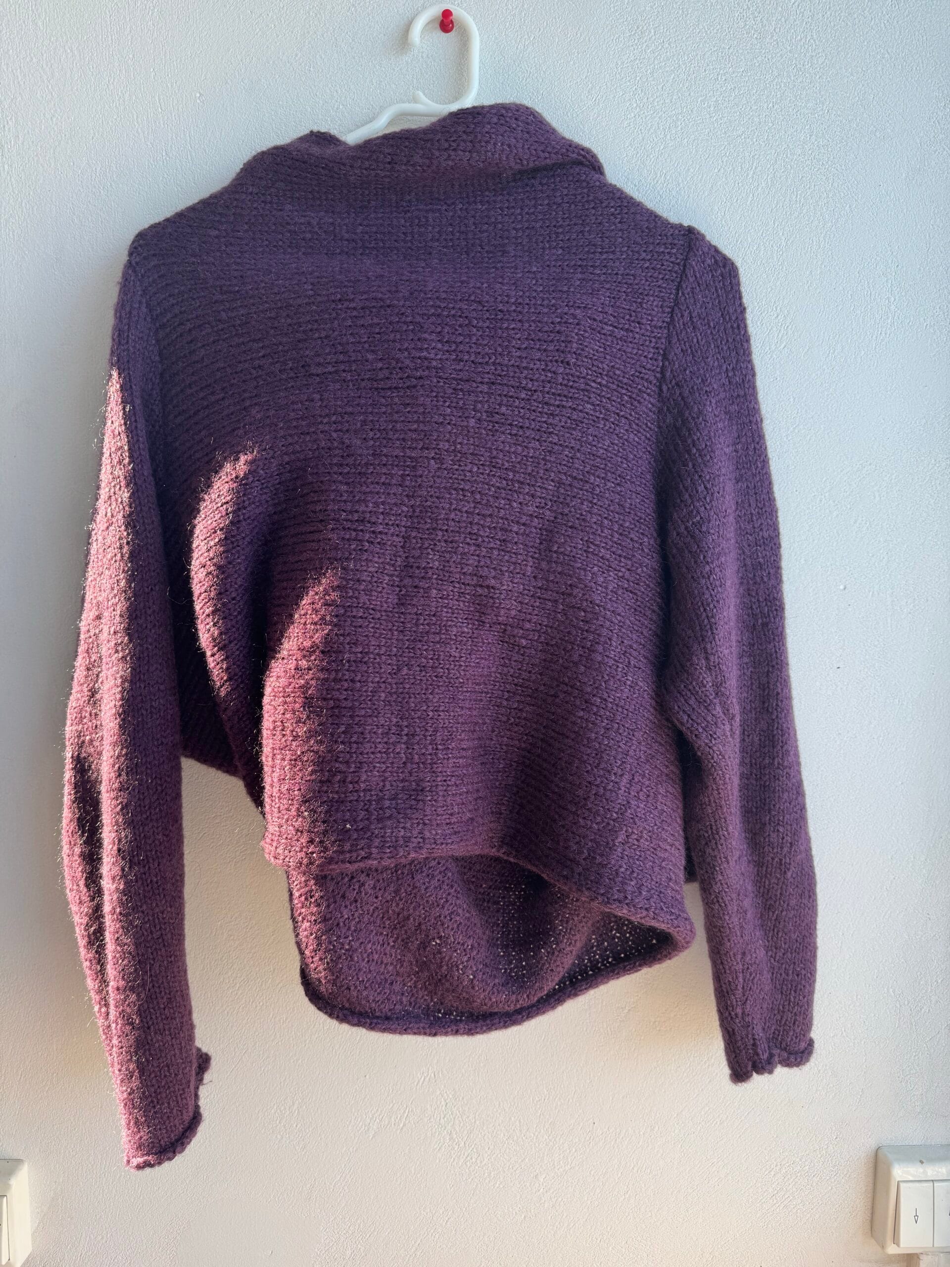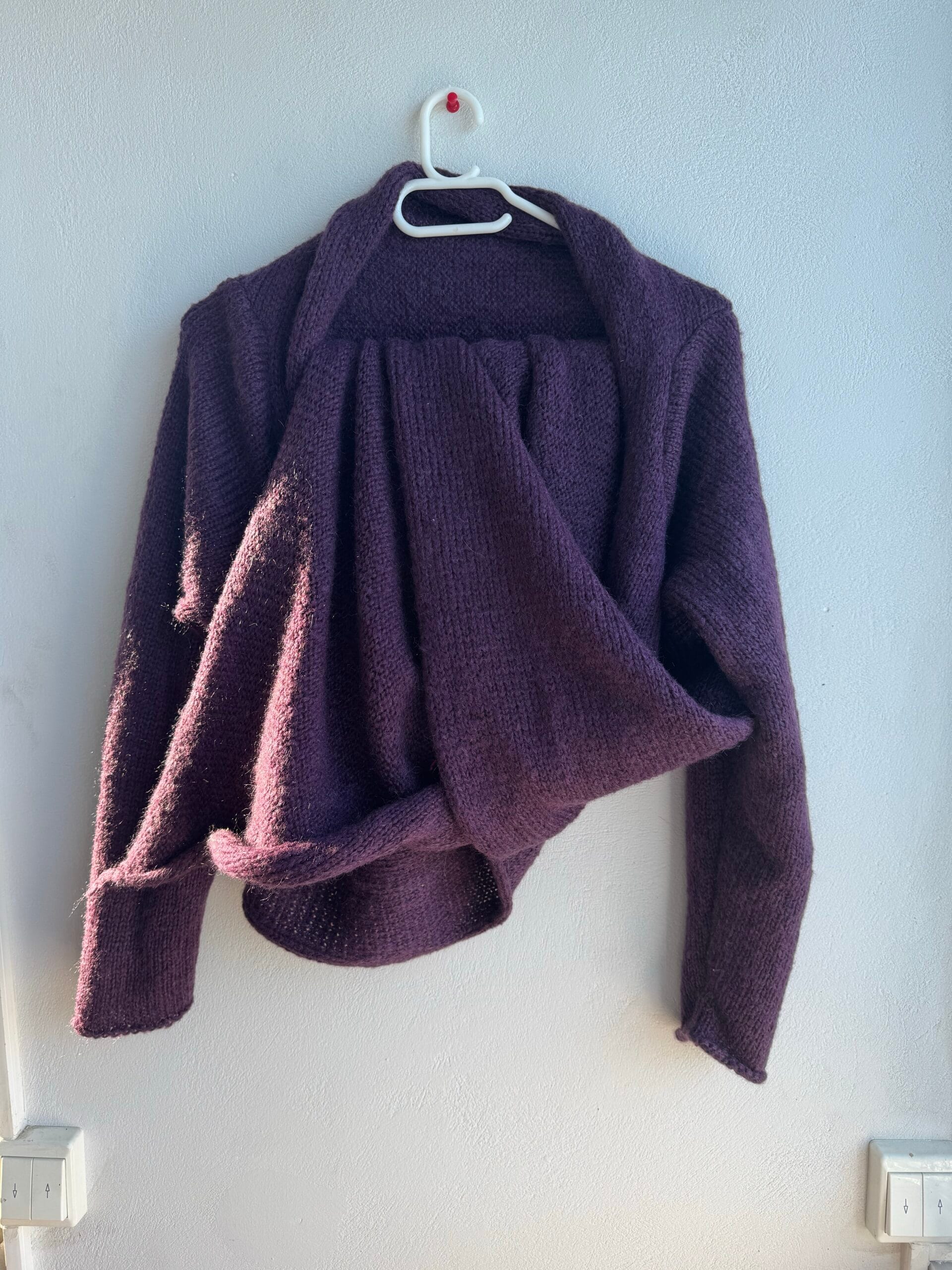 Μια μοναδική χειροποίητη πλεκτή ζακέτα σε βαθύ μωβ χρώμα, φτιαγμένη με προσοχή στη λεπτομέρεια.