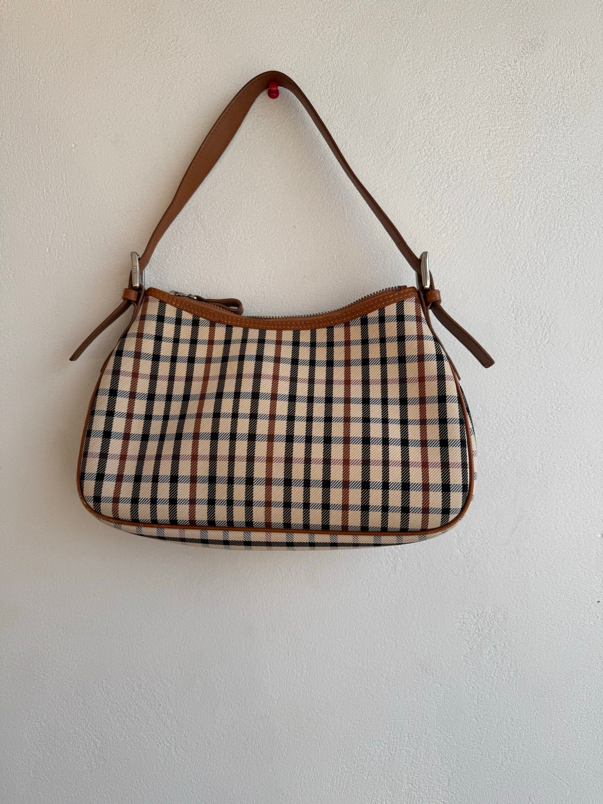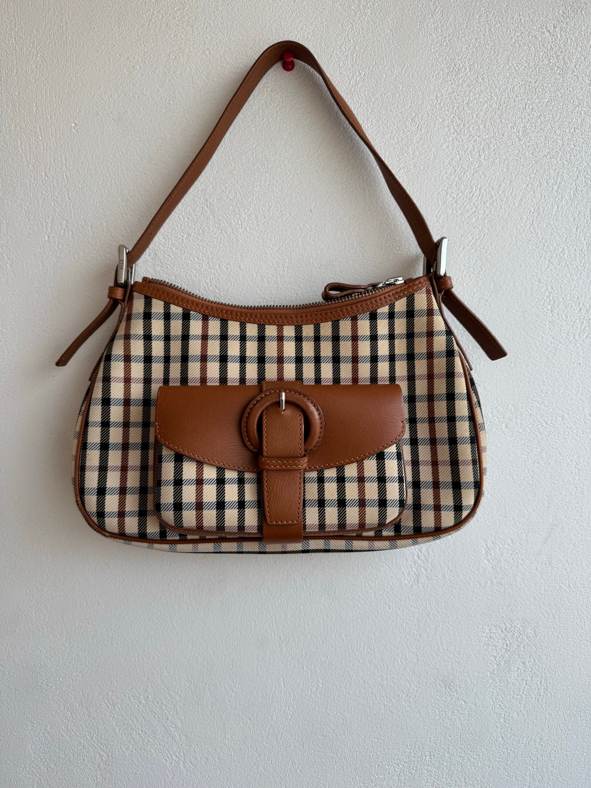 Τσάντα ώμου DAKS London με καρό μοτίβο και δερμάτινες λεπτομέρειες. Διαχρονική, κομψή και ιδανική για classic city looks.