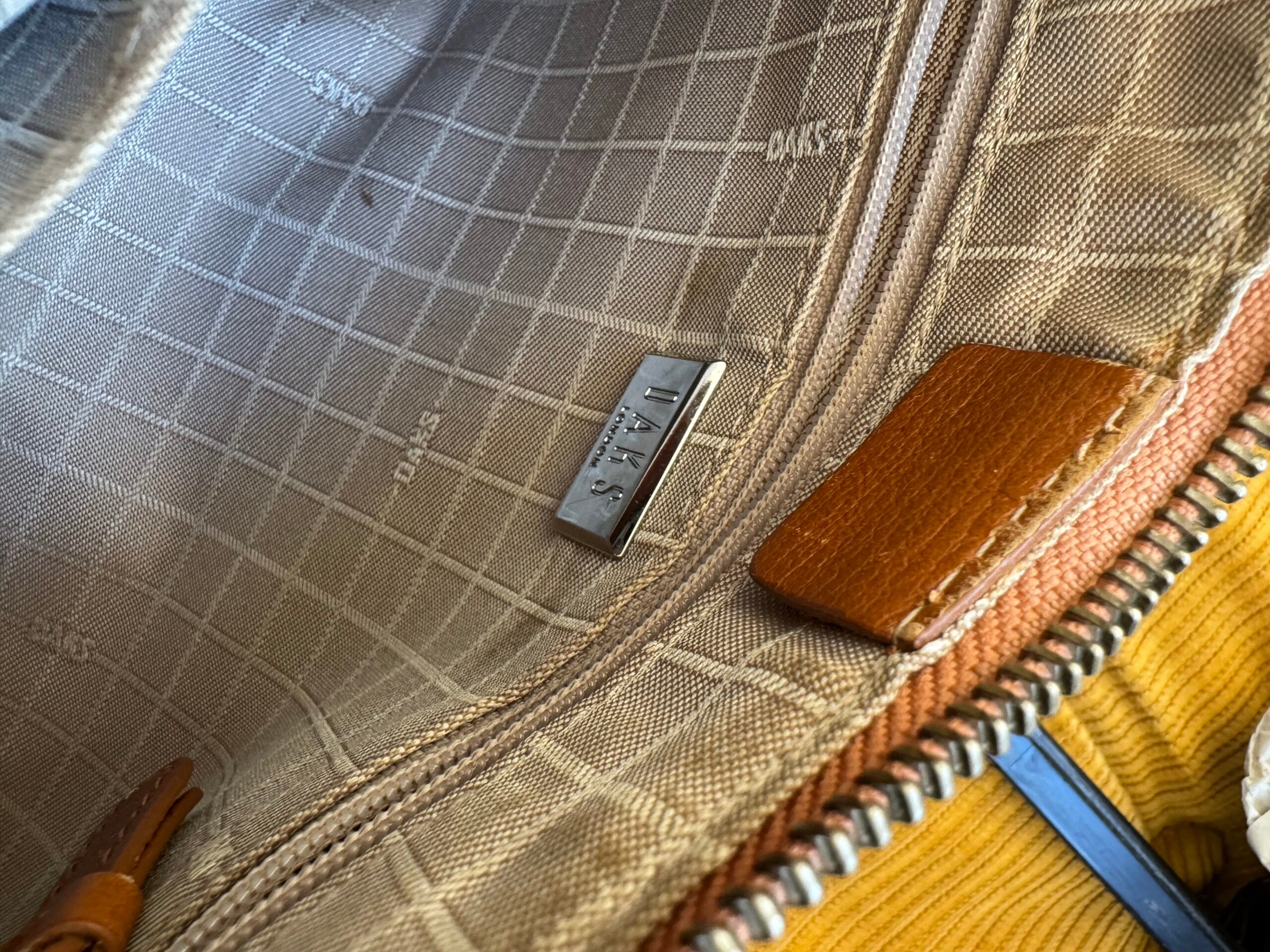 Το front pocket με αγκράφα δίνει retro χαρακτήρα, ενώ η εσωτερική επένδυση με μεταλλική πλακέτα DAKS επιβεβαιώνει την αυθεντικότητά της.