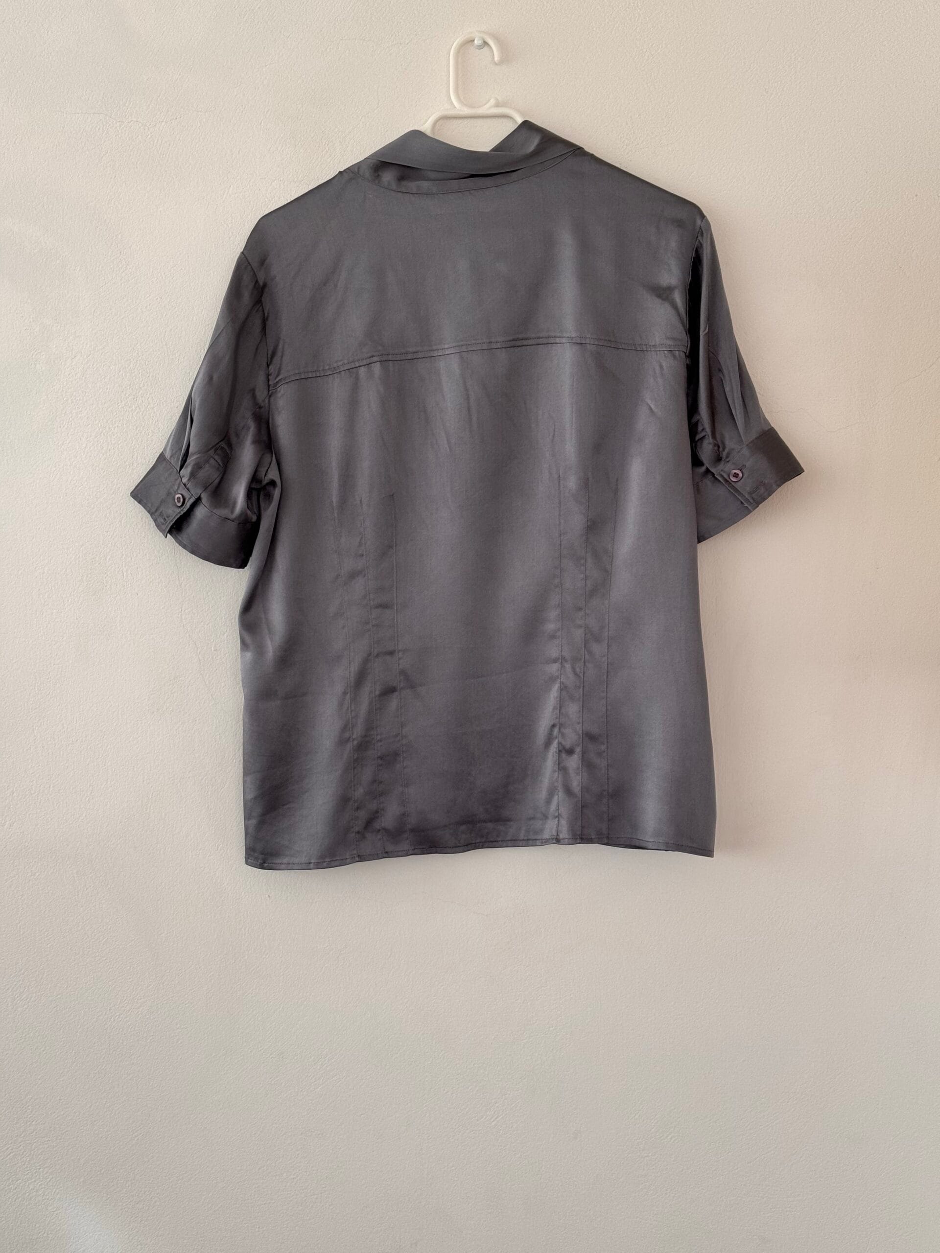 Το ύφασμα (96% μετάξι, 4% elastane) έχει σατινέ λάμψη, απαλή αίσθηση και ελαστικότητα όσο πρέπει για άνετη εφαρμογή. Η γραμμή είναι χαλαρή-κομψή και το χρώμα graphite grey κάνει το κομμάτι ευέλικτο: πάει άψογα από office έως βραδινό.