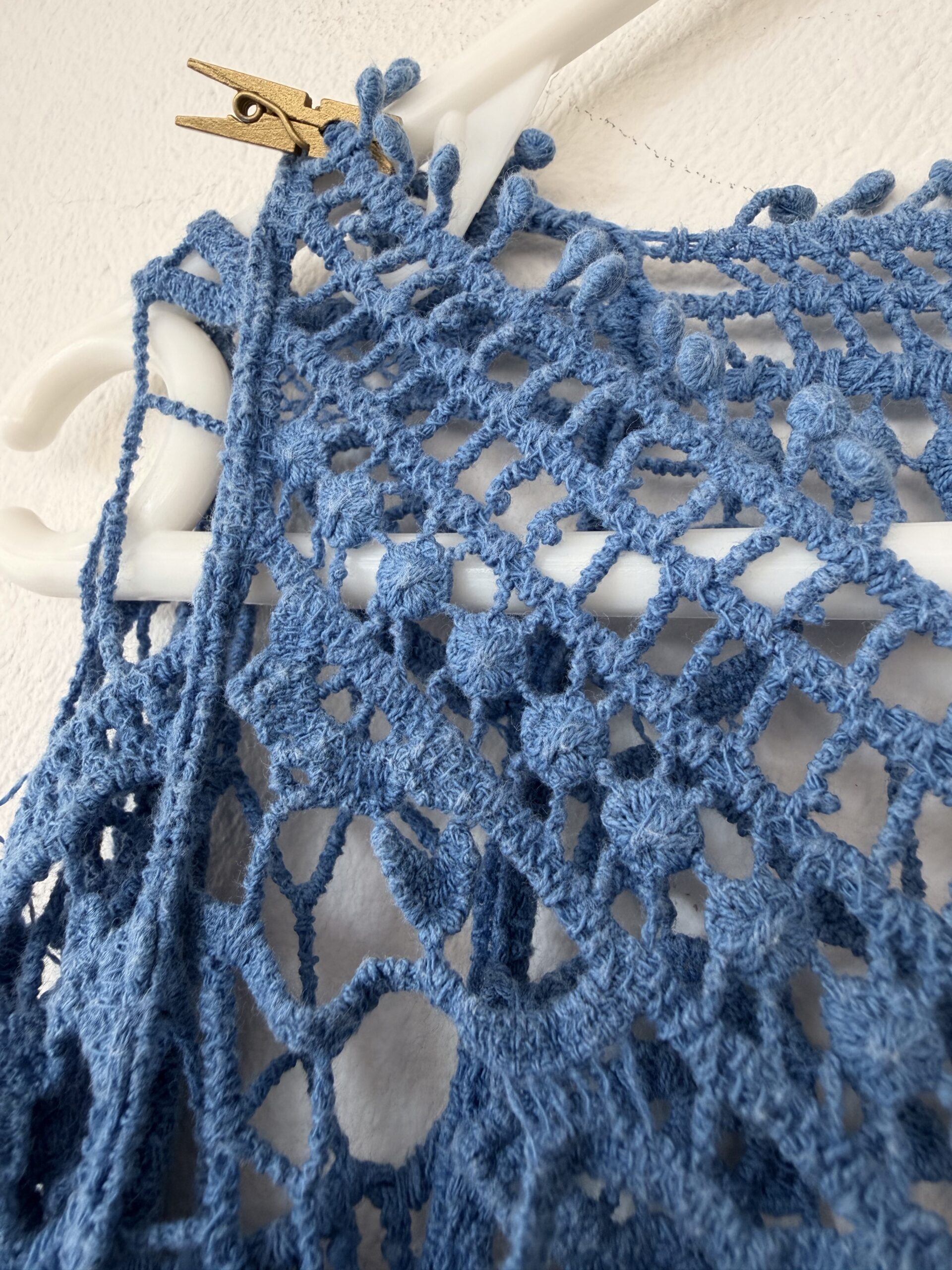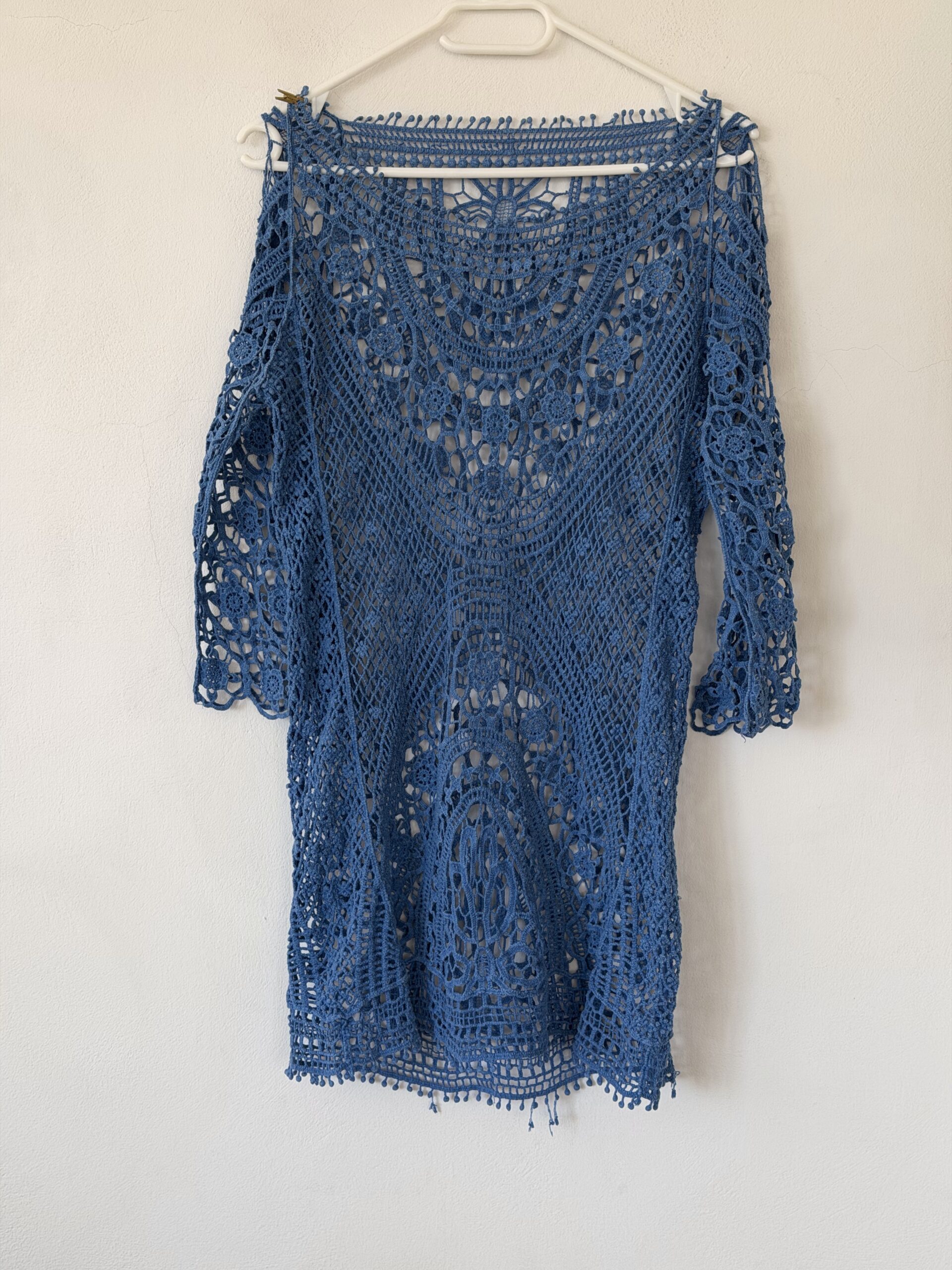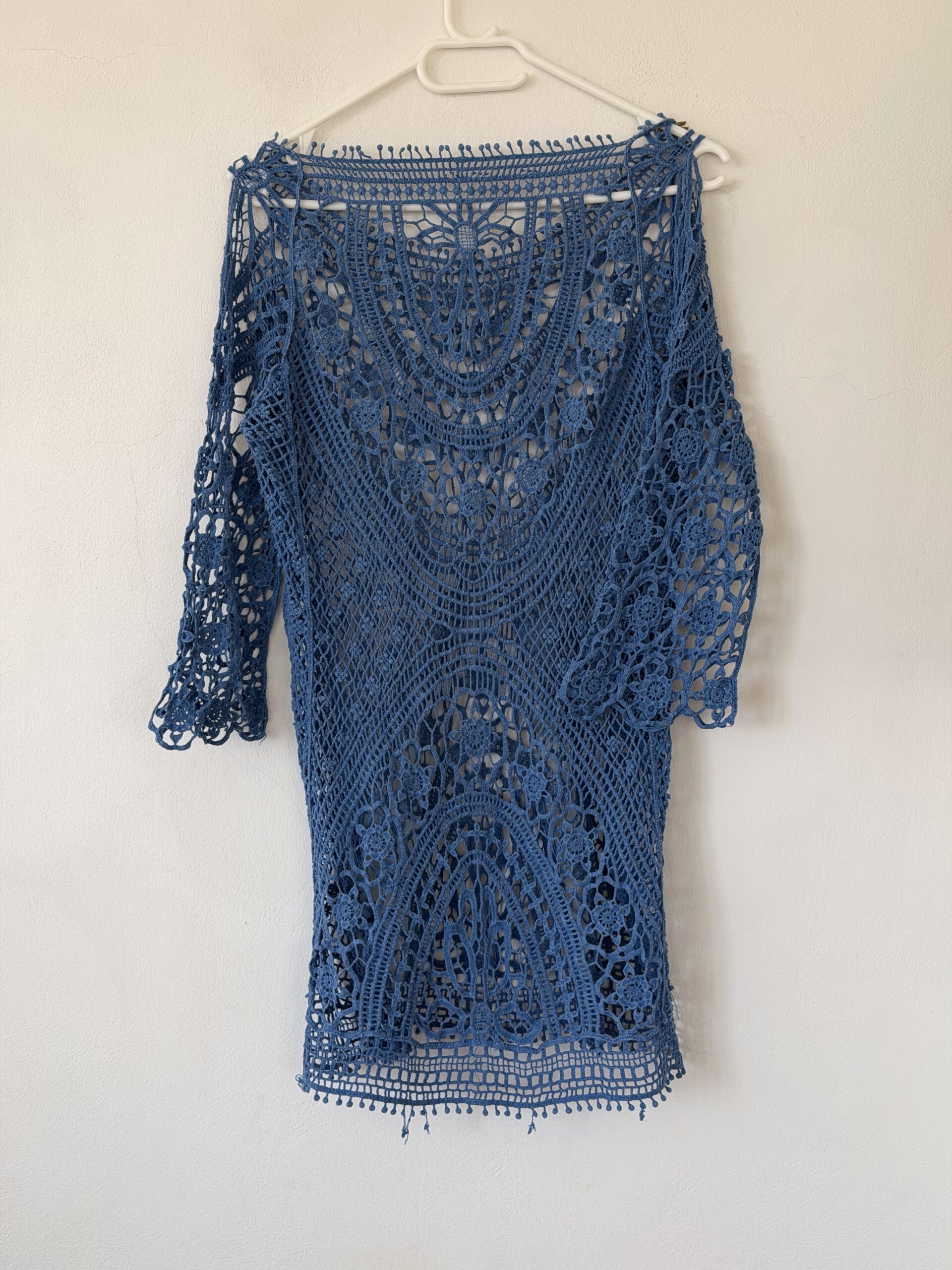 Boho Crochet Blue Tunic Dress – Sheer Lace Cover-Up (S/M)
