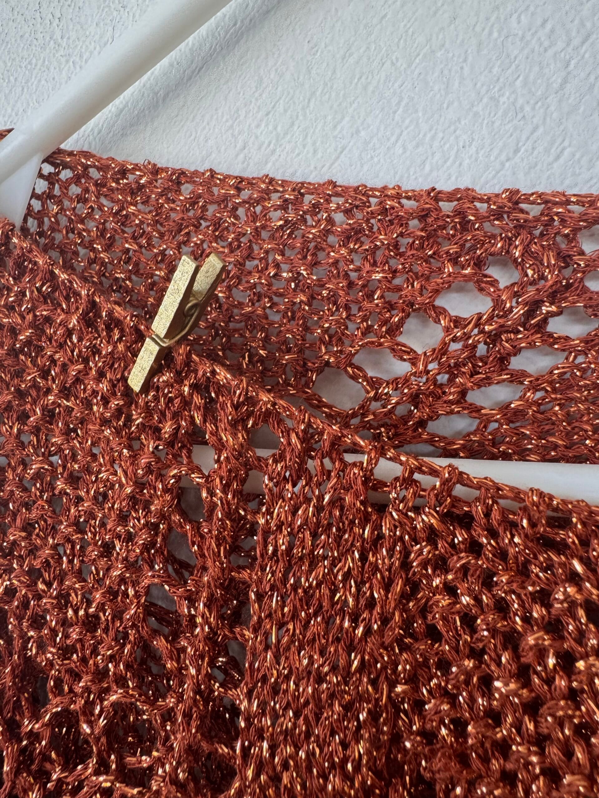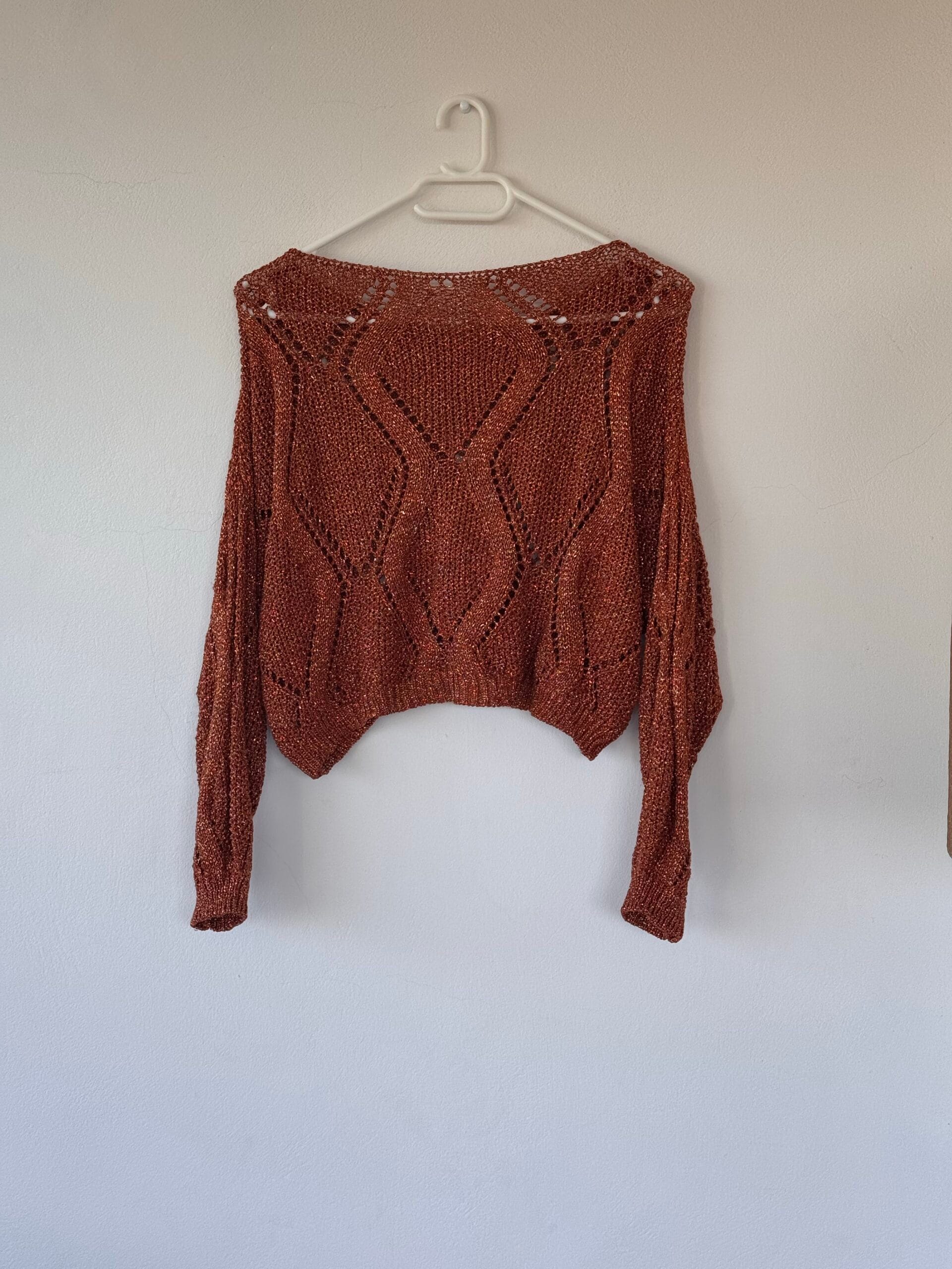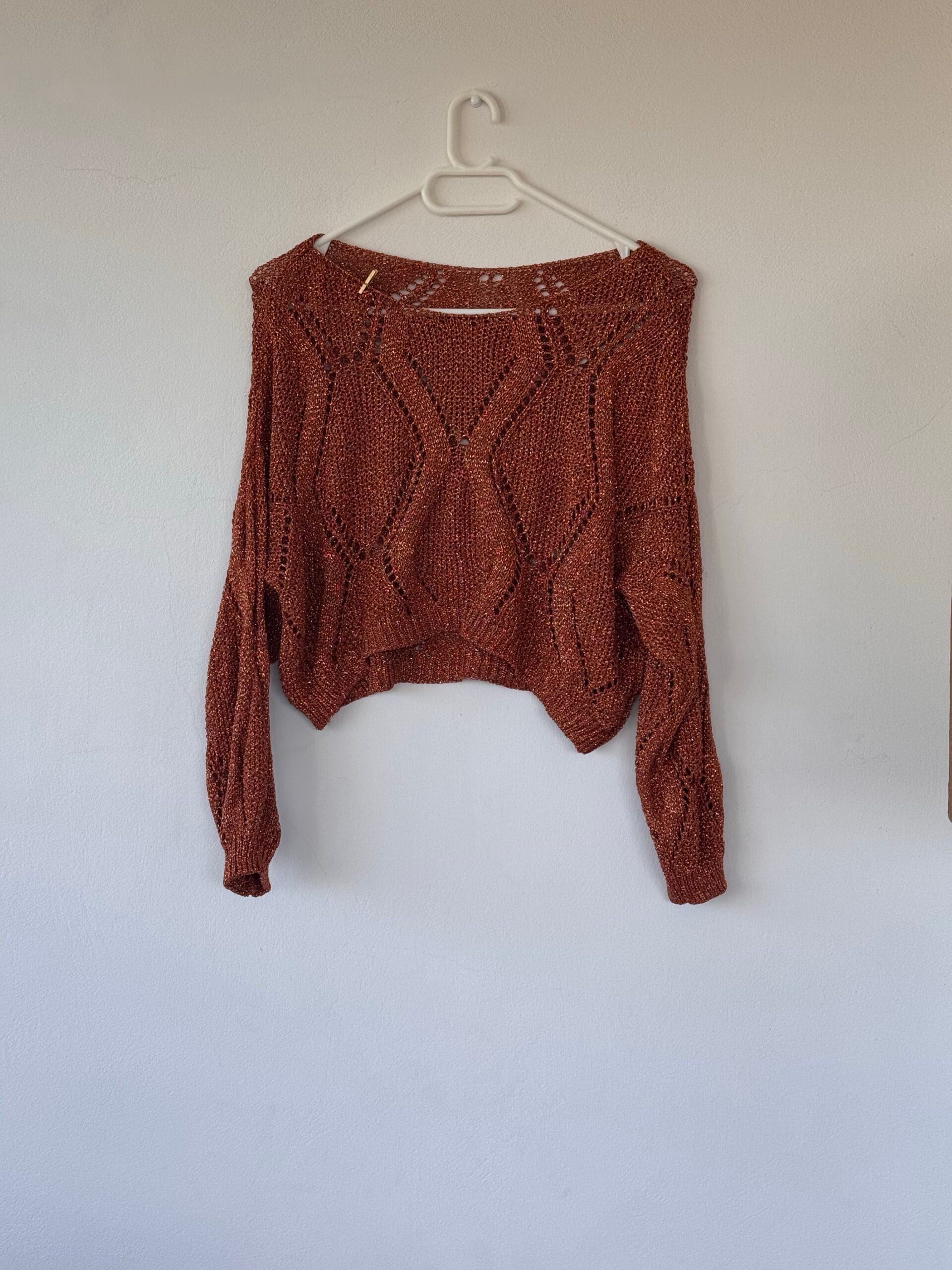 Cropped πλεκτό top σε ζεστή copper απόχρωση με μεταλλική λάμψη και ανοιχτή πλέξη.