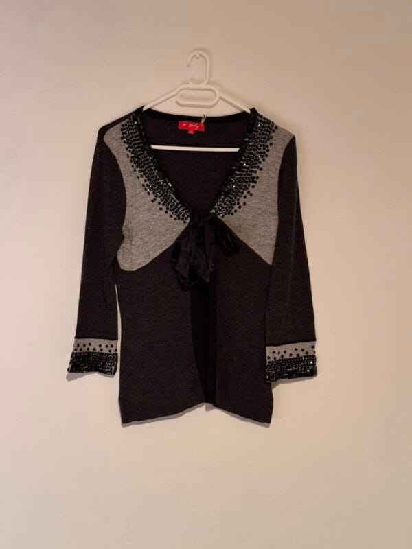 Κομψή ζακέτα Derhy σε ανθρακί–γκρι, με χειροποίητο beading στους ώμους και στα μανίκια. Κλείνει με satin κορδέλα για θηλυκή, refined εμφάνιση.
