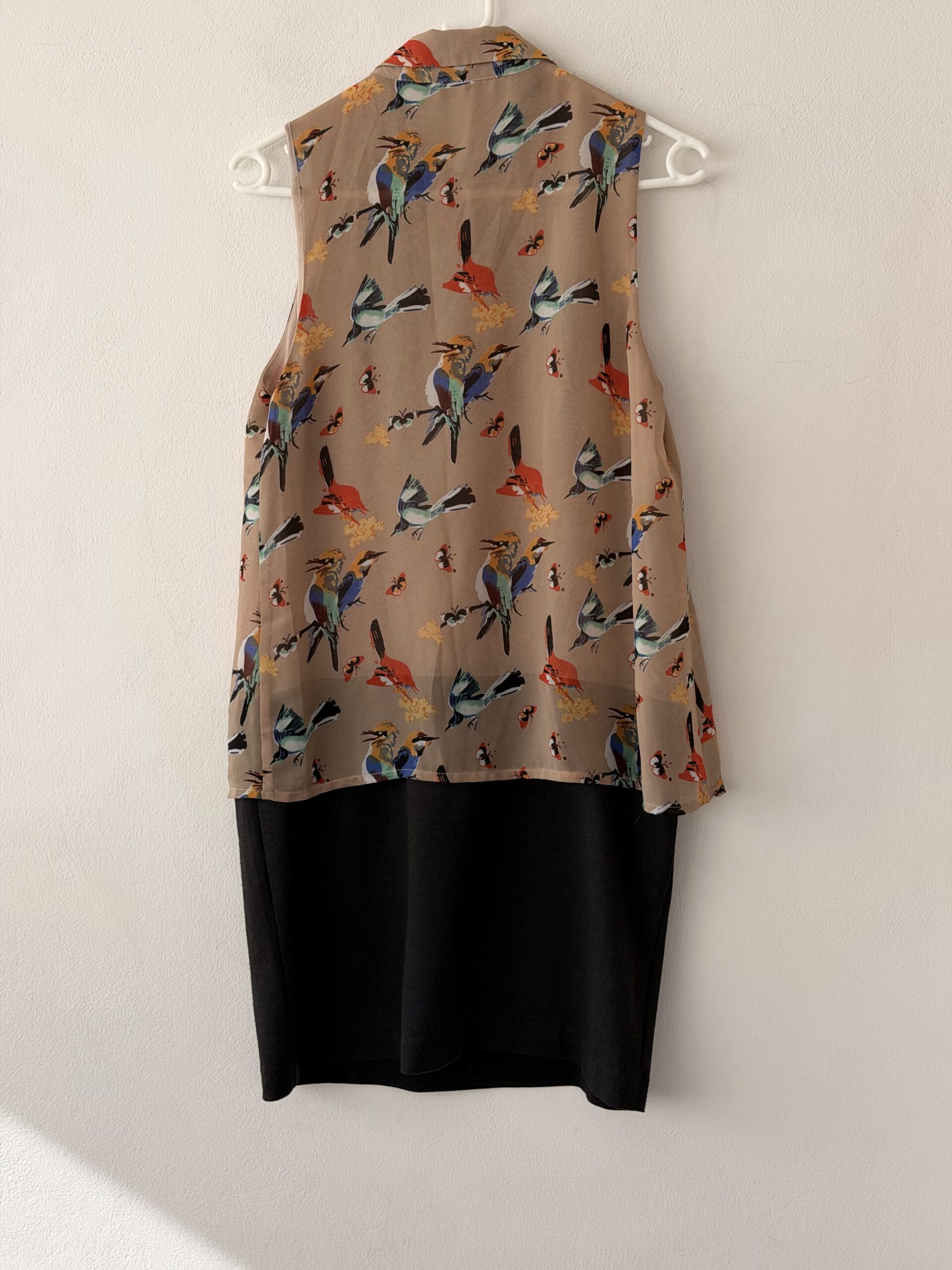 Midi φόρεμα με ιδιαίτερο bird print σε γήινους nude τόνους και μαύρη contrast φούστα για πιο structured αποτέλεσμα. Ένα κομμάτι εύκολο αλλά statement.
