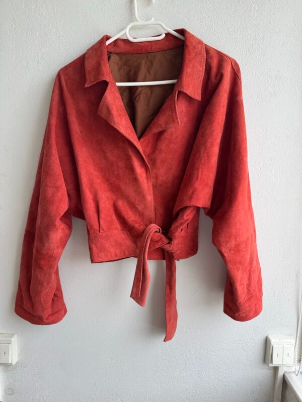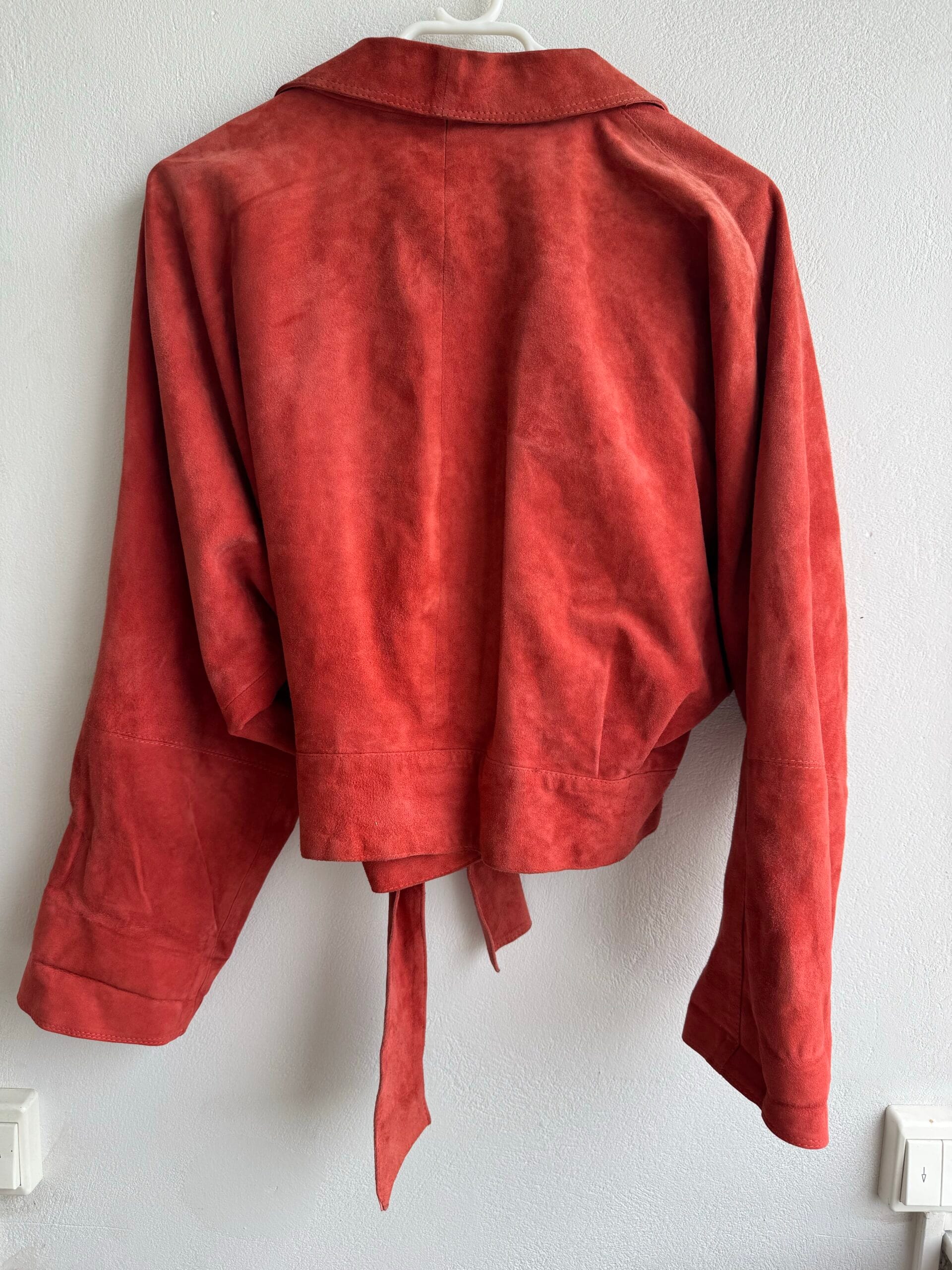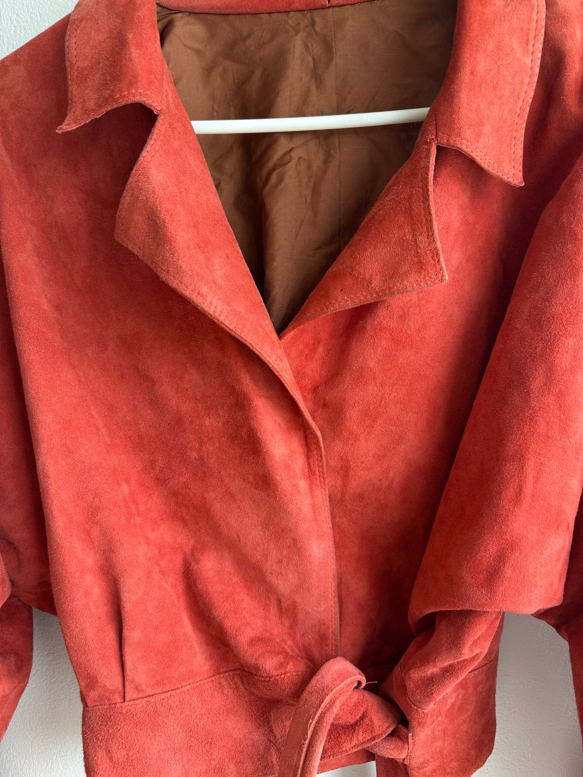 Χειροποίητο jacket από 100% suede σε έντονο χρώμα αστακού. Με βαμβακερή φόδρα και ζώνη που δένει στη μέση. One of a kind, εξαιρετικά απαλό στην αφή και σε άριστη κατάσταση. Size: S