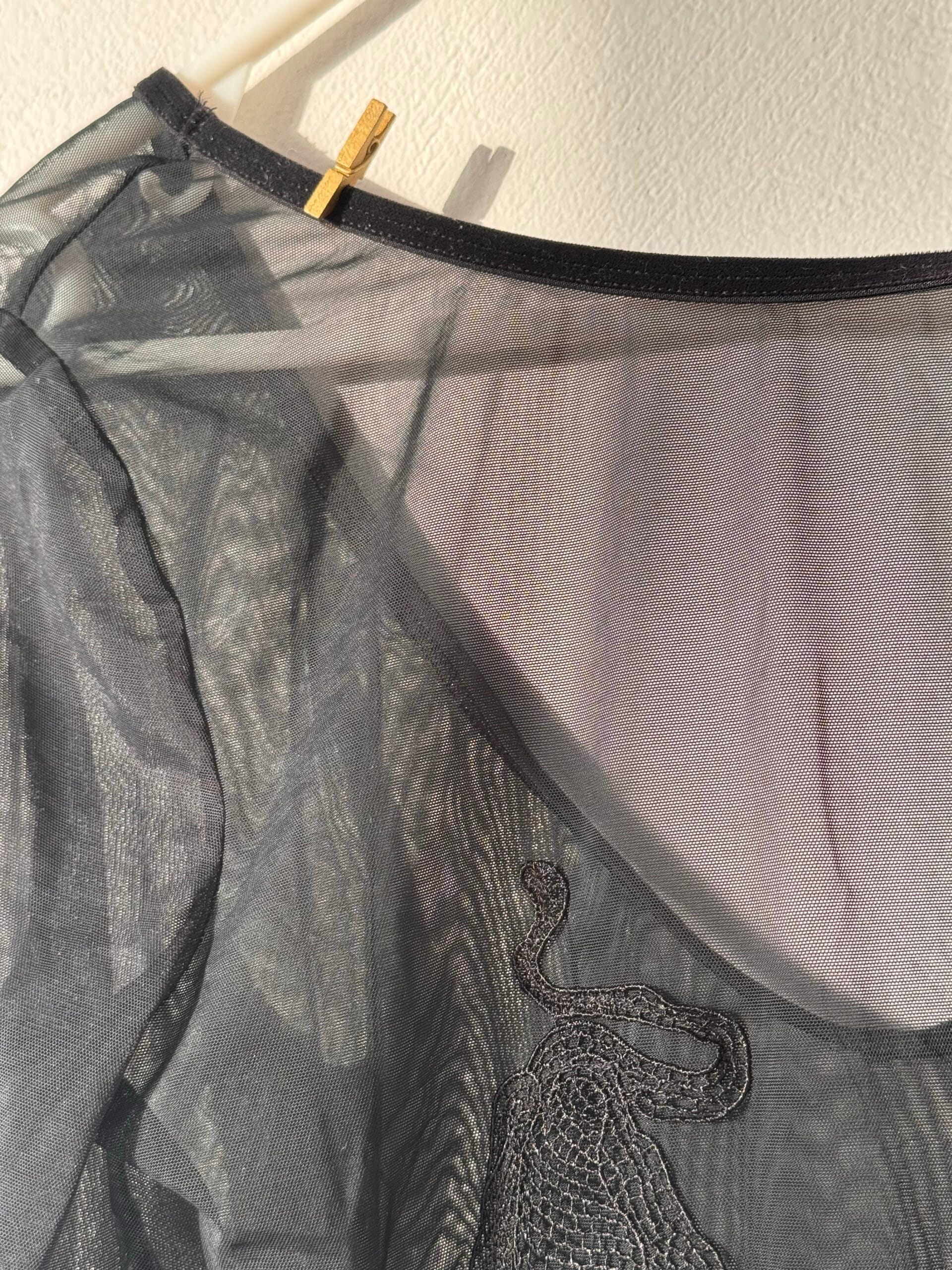 Αισθησιακό bodysuit από διάφανο μαύρο mesh, με κομψό απλικέ στο στήθος και βαθύ V ντεκολτέ. Μακρύ μανίκι και εφαρμοστή γραμμή που αγκαλιάζει το σώμα χωρίς να βαραίνει οπτικά. Ιδανικό για layering κάτω από σακάκι ή cardigan, αλλά και ως statement κομμάτι για βραδινές εμφανίσεις. Κουμπώνει στο κάτω μέρος για άνετη εφαρμογή. Κομμάτι υψηλής ποιότητας, χαρακτηριστικό της αισθητικής Intimissimi