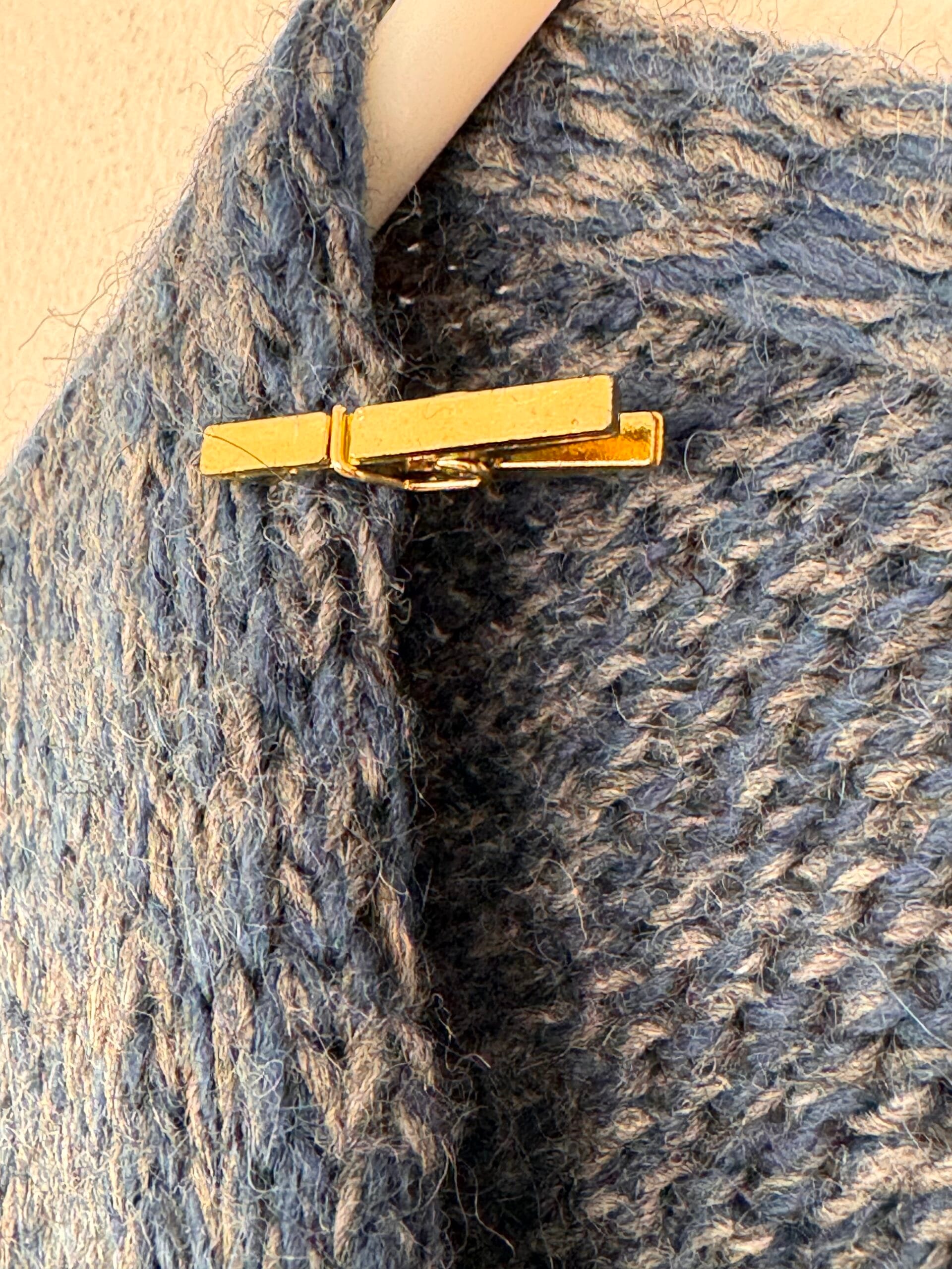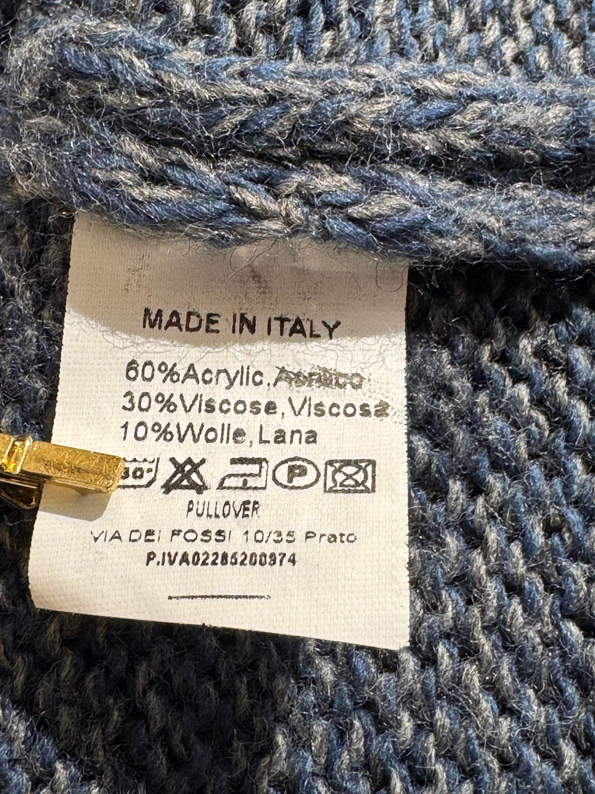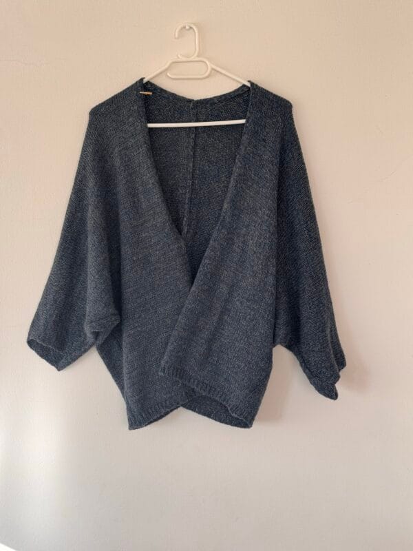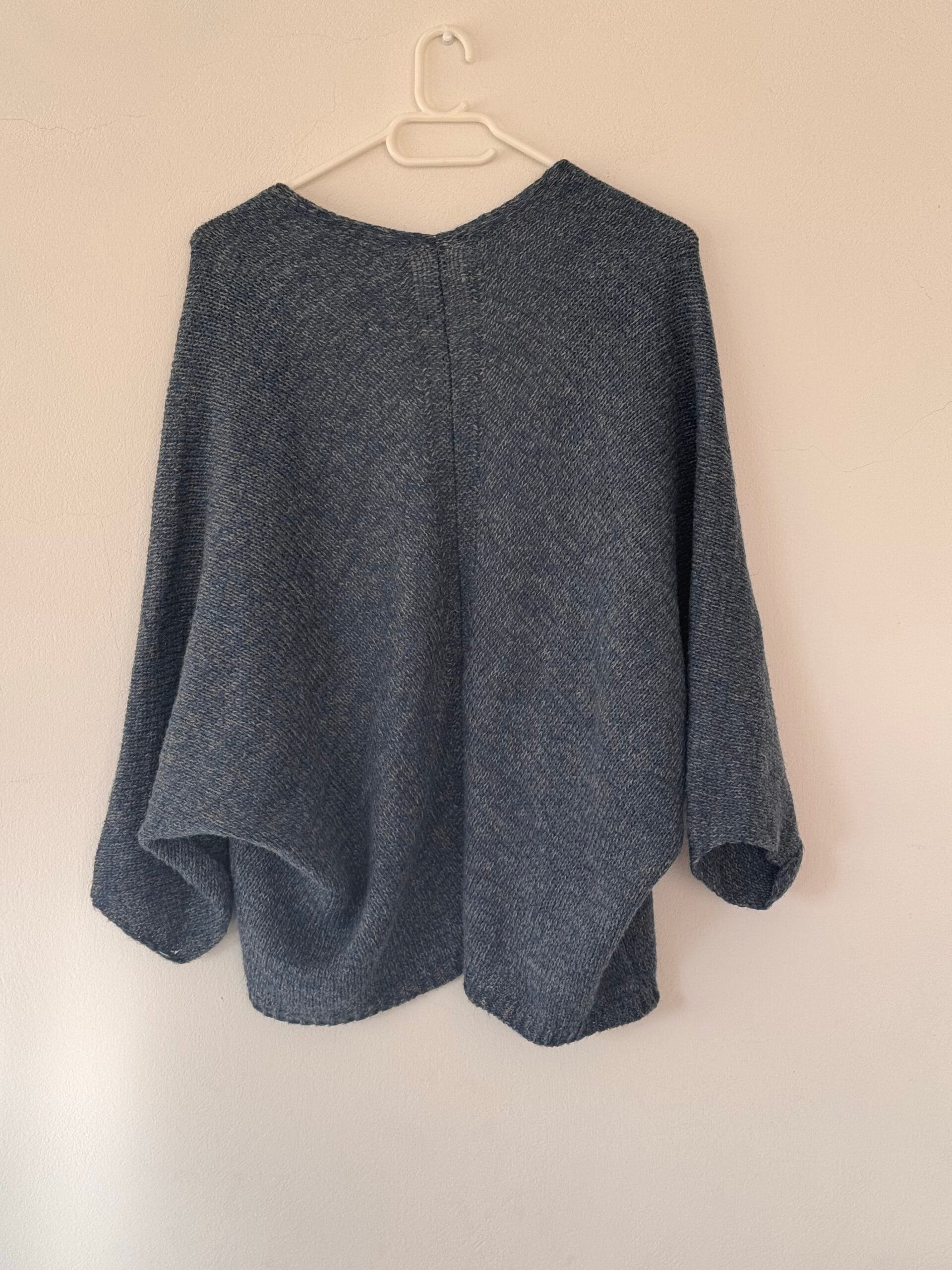 Ζεστό ιταλικό poncho–καρντιγκαν σε γκρι–μπλε mélange πλέξη, με χαλαρή εφαρμογή και άνετη γραμμή που ταιριάζει σε όλα τα σώματα. One size.