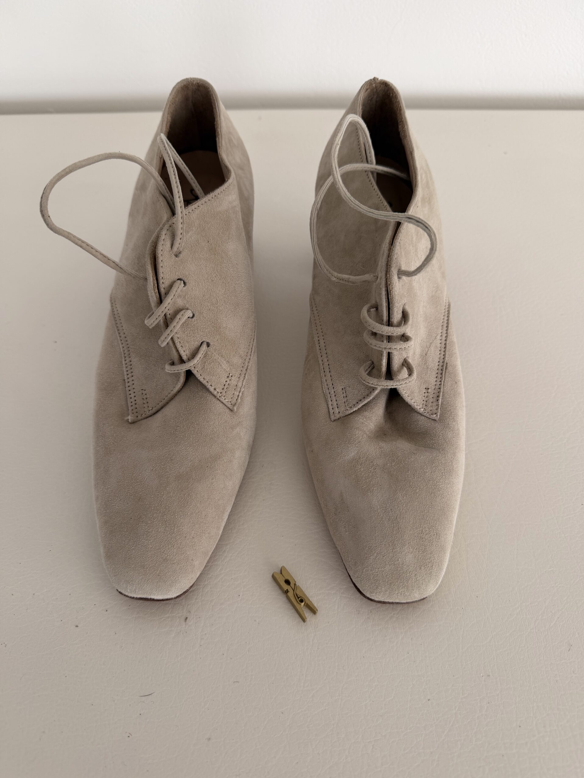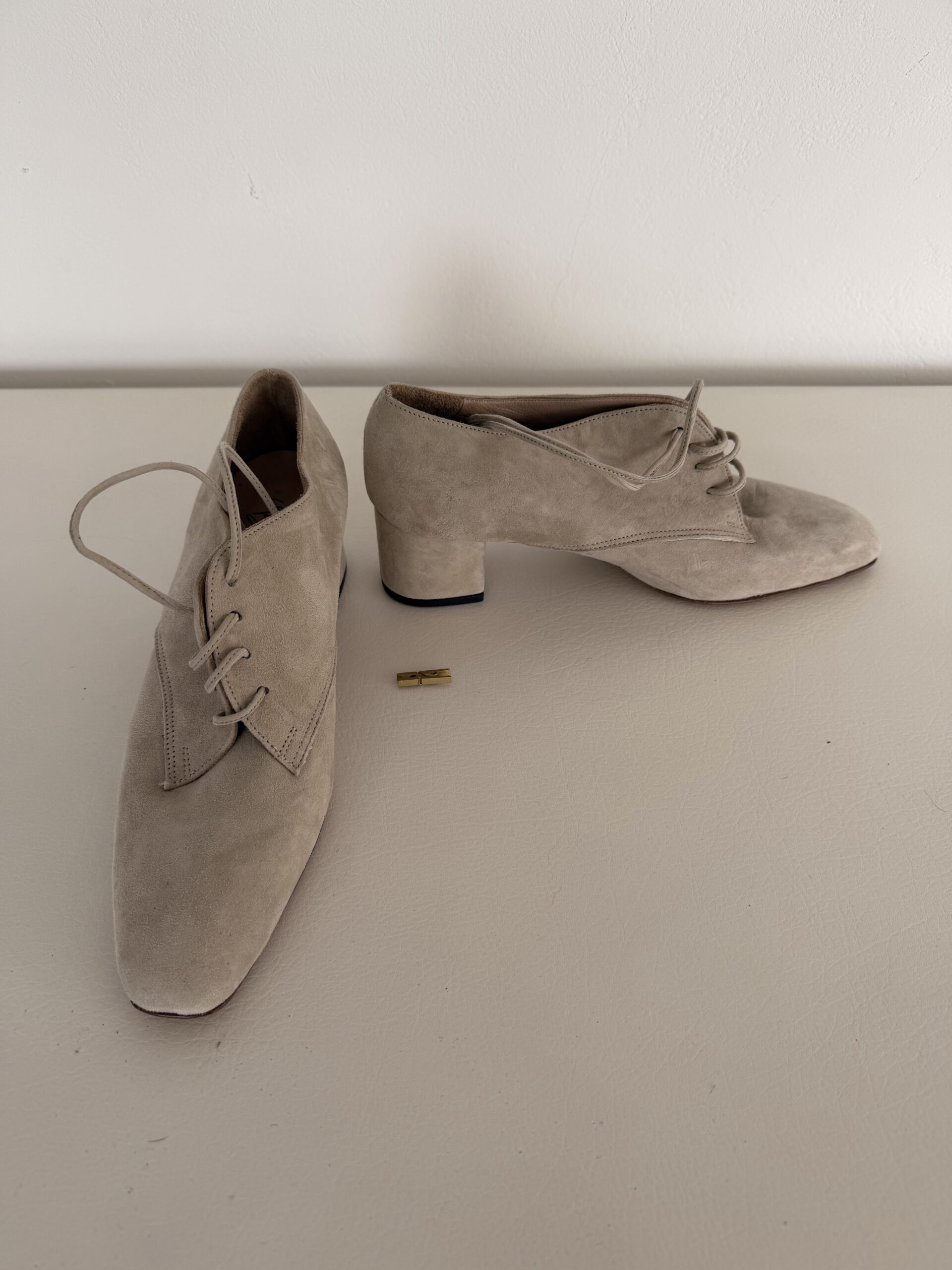 Minimal suede σε κομψό taupe τόνο με lace-up oxford γραμμή και σταθερό χαμηλό τακούνι.