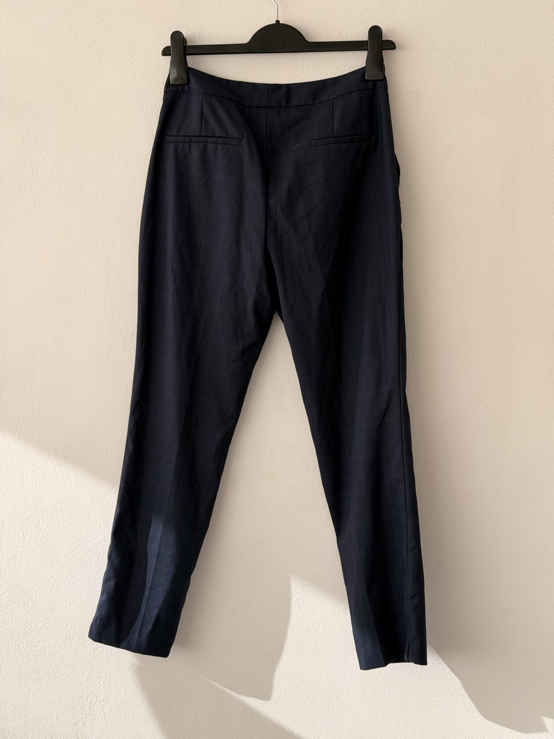 Minimal tailored navy παντελόνι με διακριτικό καρό μοτίβο και elegant γραμμή. Το απόλυτο capsule wardrobe essential.