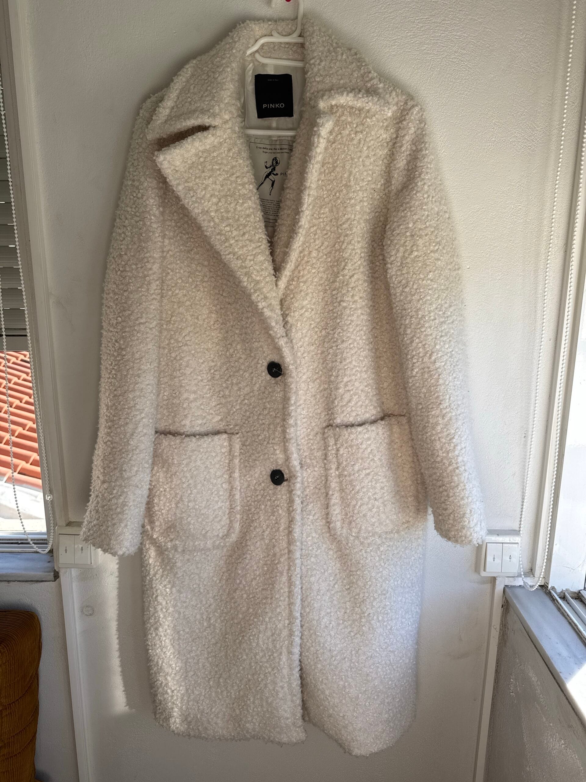 Το Pinko Teddy Coat σε απόχρωση ivory bouclé είναι η απόλυτη επένδυση για τις κρύες μέρες του φθινοπώρου και του χειμώνα.
