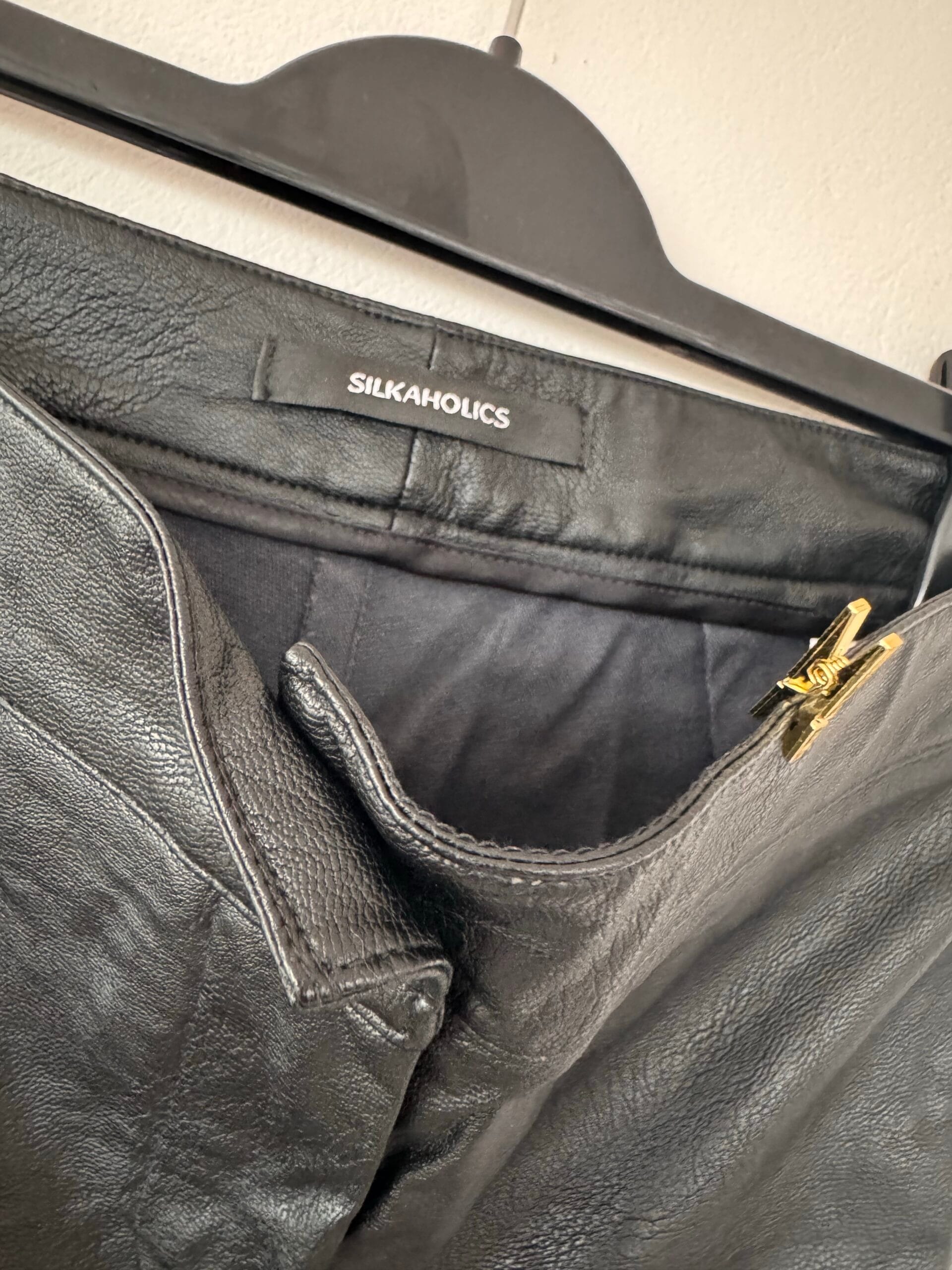 Από τη συλλογή της Silkaholics, αυτό το μαύρο παντελόνι είναι φτιαγμένο στην Ιταλία και έχει premium leather-effect υφή που δίνει edgy αλλά κομψό αποτέλεσμα.