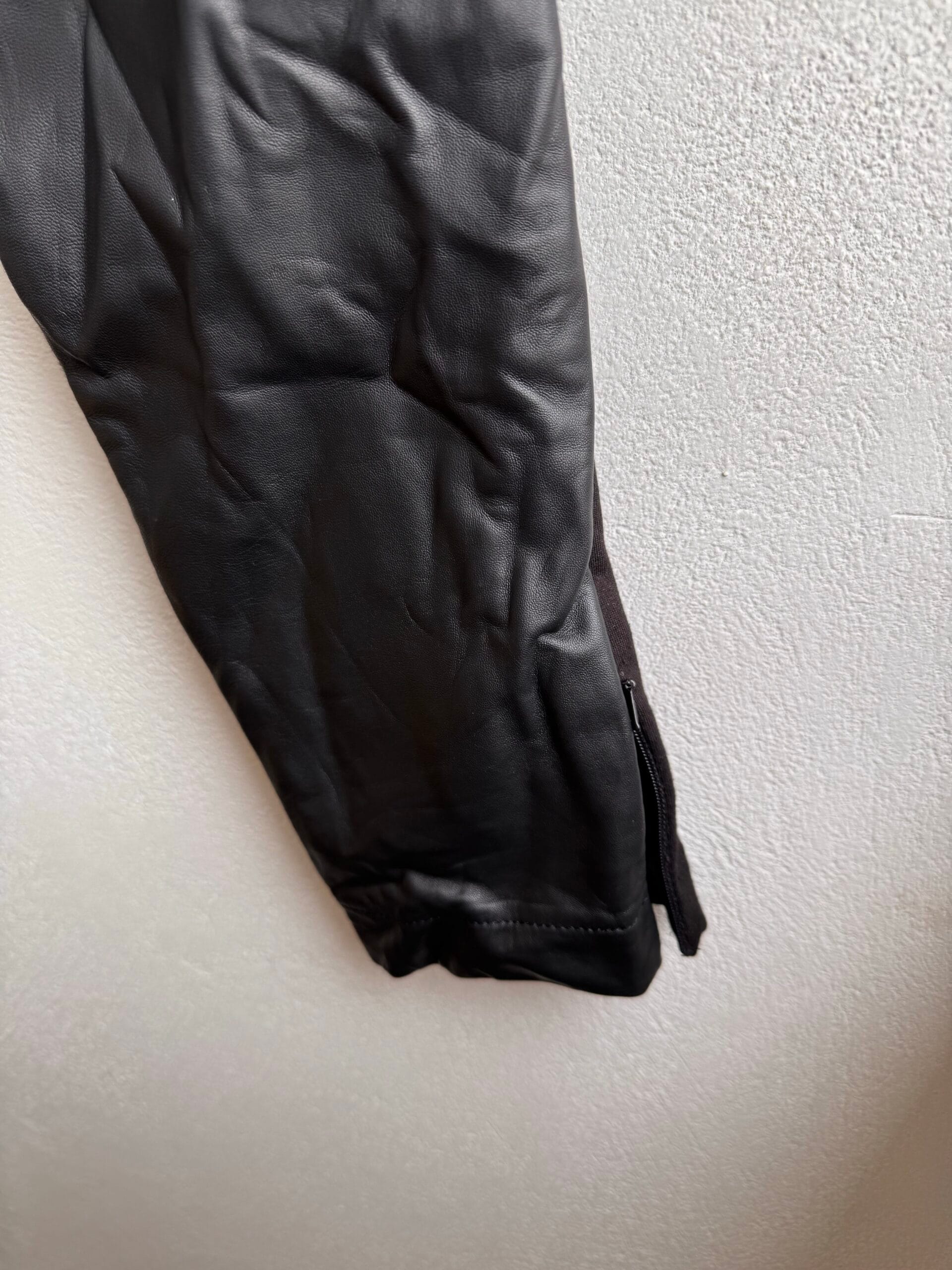 Μαύρο παντελόνι Stefanel με δερμάτινο μπροστινό μέρος και ελαστικό ύφασμα πίσω. Minimal, high-end αισθητική με διακριτικά φερμουάρ στους αστραγάλους