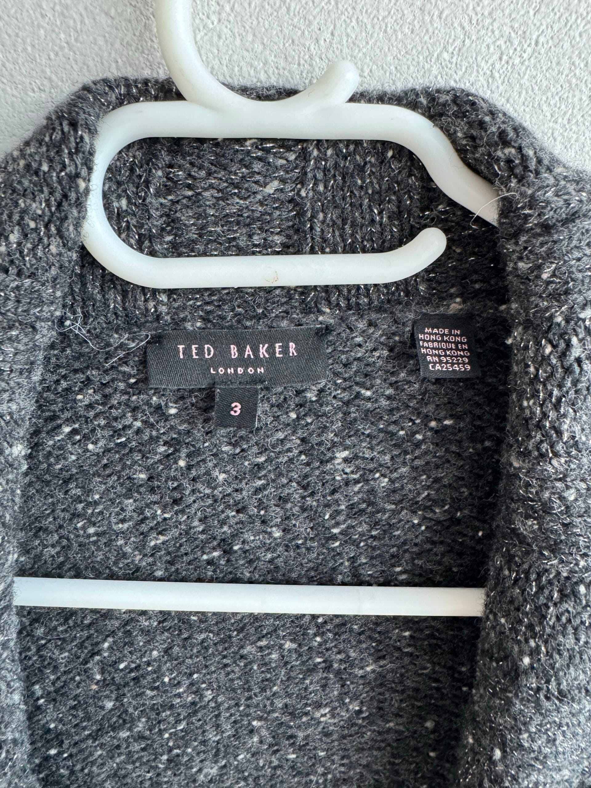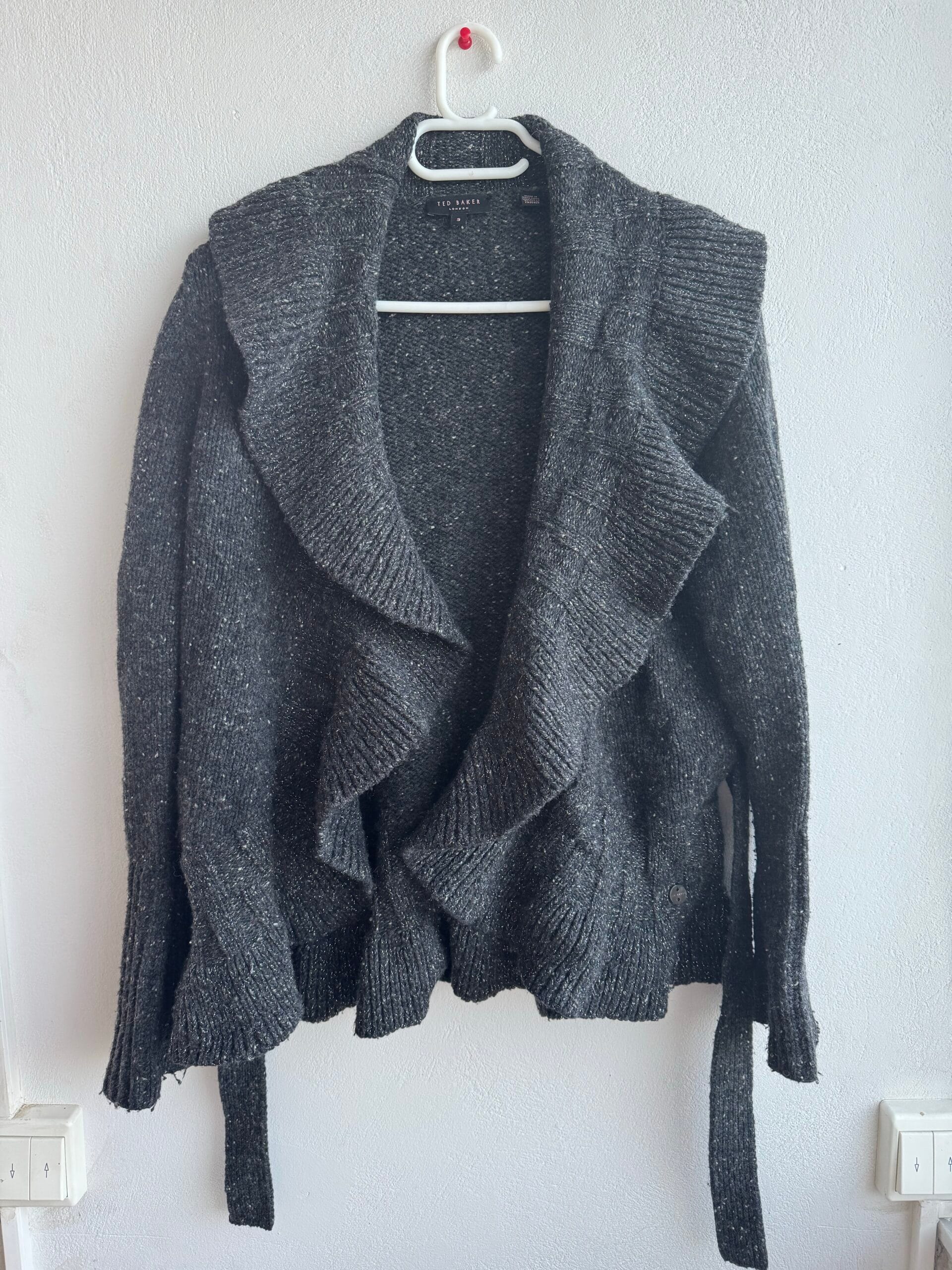 Γκρι ζακέτα Ted Baker με βολάν γιακά και ζώνη μέσης. Κομψή, διαχρονική και ιδανική για day-to-night εμφανίσεις. Μέγεθος UK 3 (EU 38/40).
