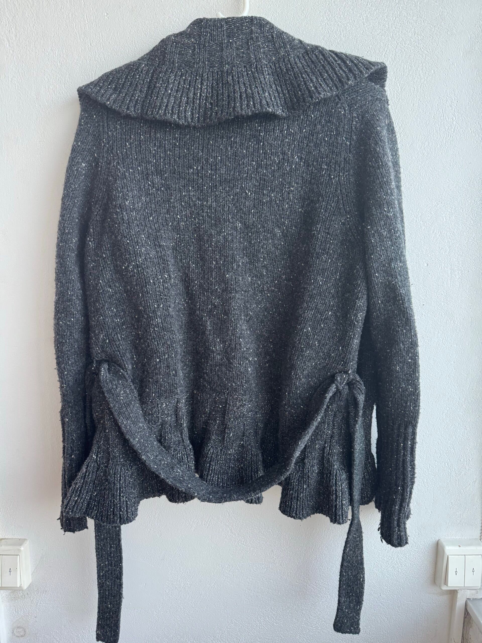 Ζακέτα σε σκούρο γκρι με διακριτικό speckled μοτίβο, πλούσιο γιακά με βολάν και ζώνη στη μέση για τέλεια εφαρμογή.