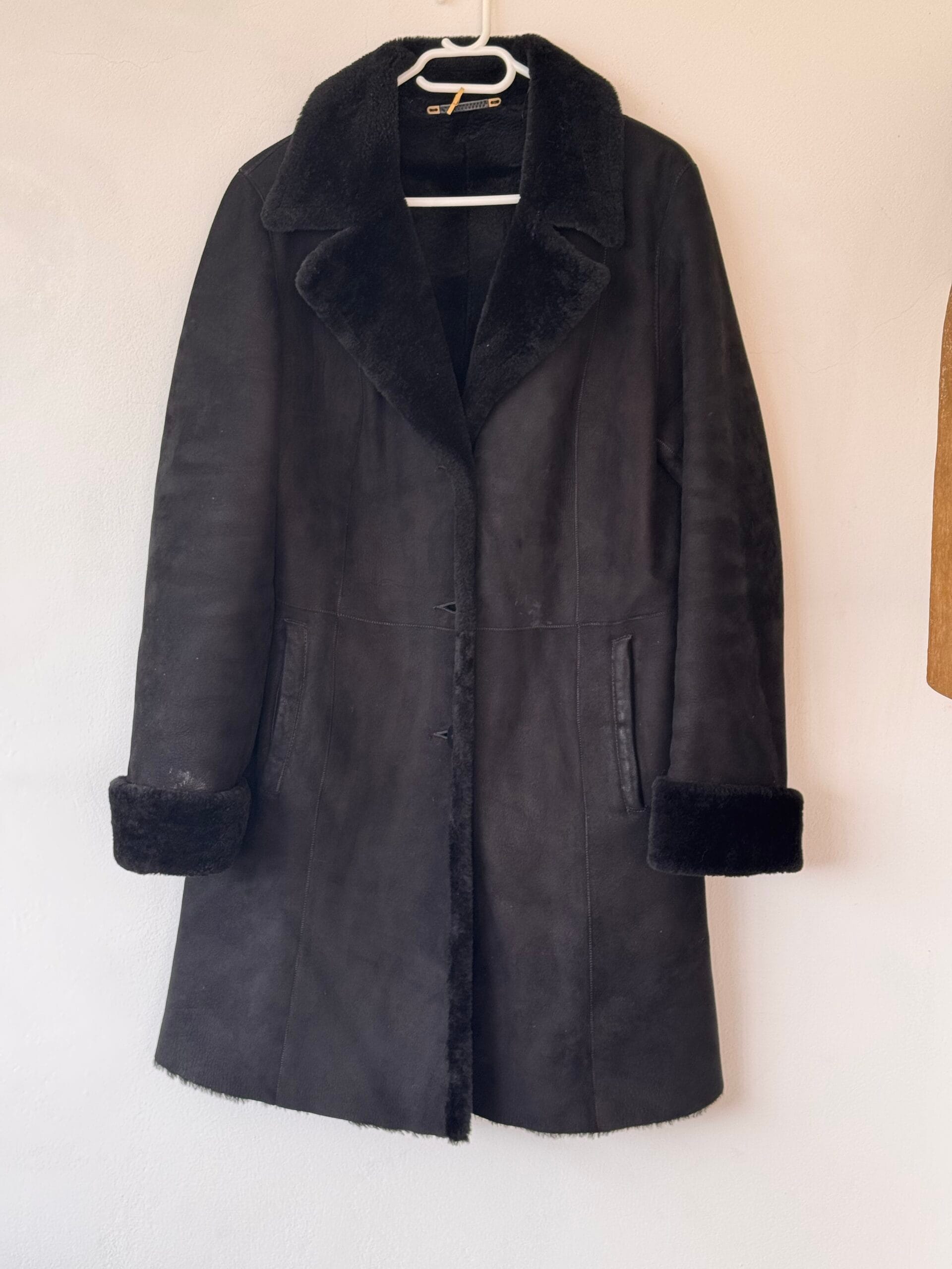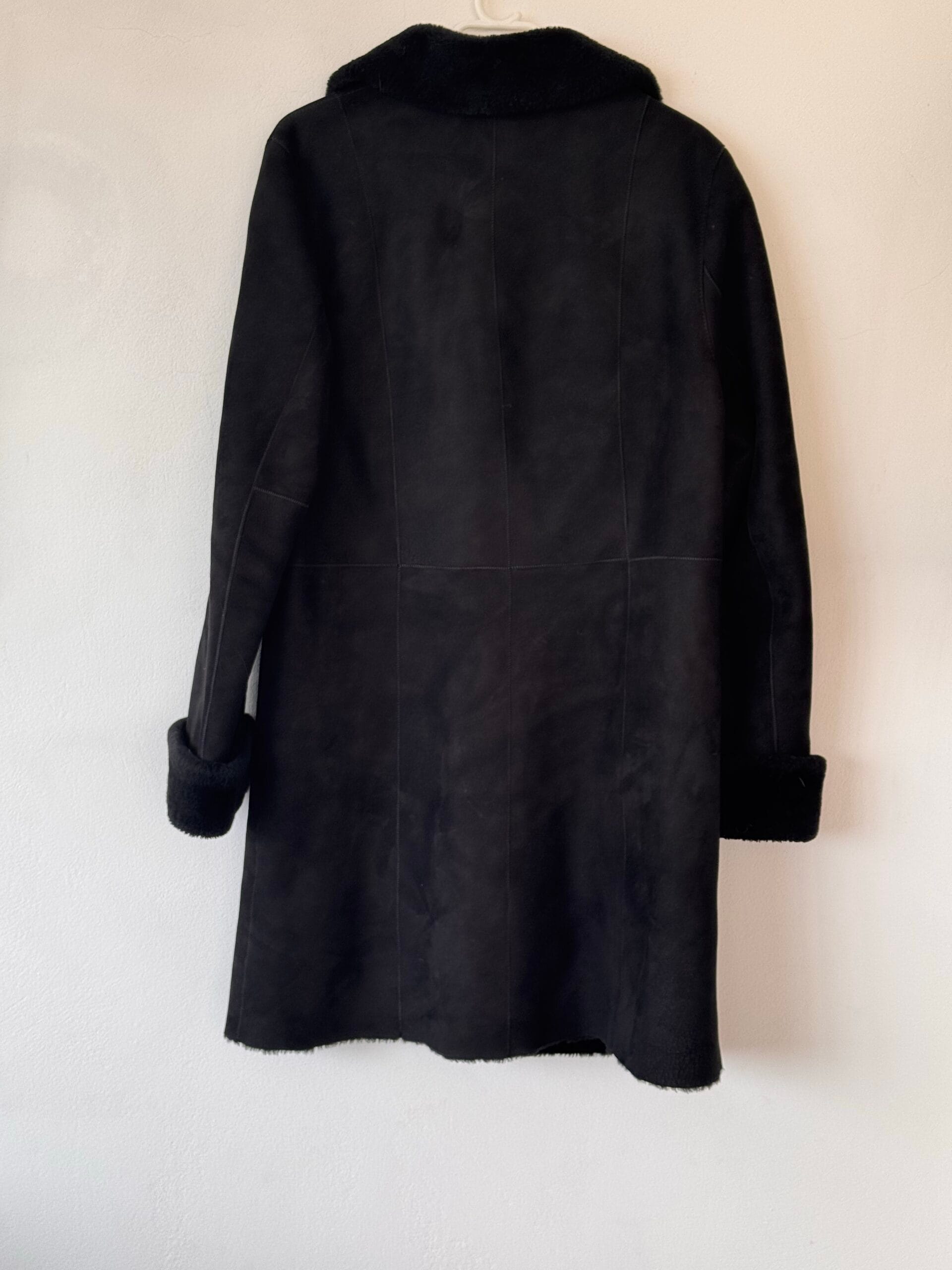 Εμβληματικό μαύρο shearling παλτό από αληθινό suede και φυσική γούνα, σε διαχρονική γραμμή που δεν φεύγει ποτέ από τη μόδα.