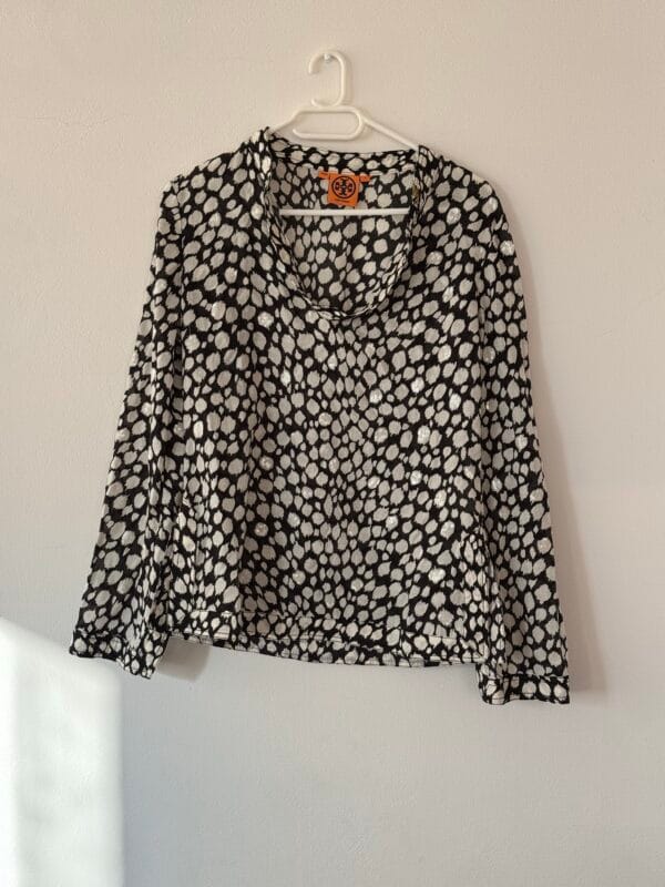 Αυθεντική Tory Burch μπλούζα σε ασπρόμαυρο abstract print, 100% βαμβάκι. Μέγεθος US 6 (EU 38). Ανάλαφρη, κομψή και ιδανική για all–day chic εμφανίσεις.
