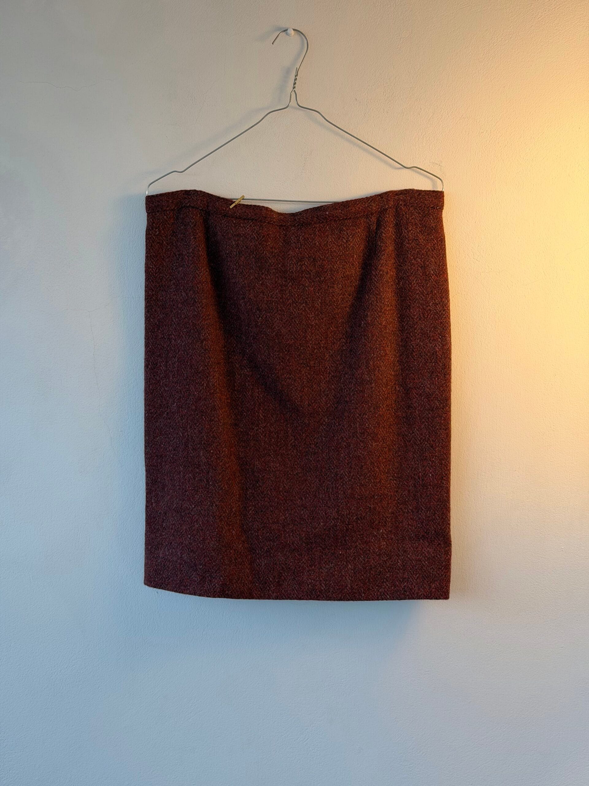 Vintage μάλλινη φούστα σε pencil γραμμή, με καθαρές ραφές και διακριτικό άνοιγμα πίσω για άνεση στην κίνηση. Το ύφασμα έχει πλούσια, μαλακή υφή (όχι tweed), προσφέροντας δομή χωρίς σκληρότητα.