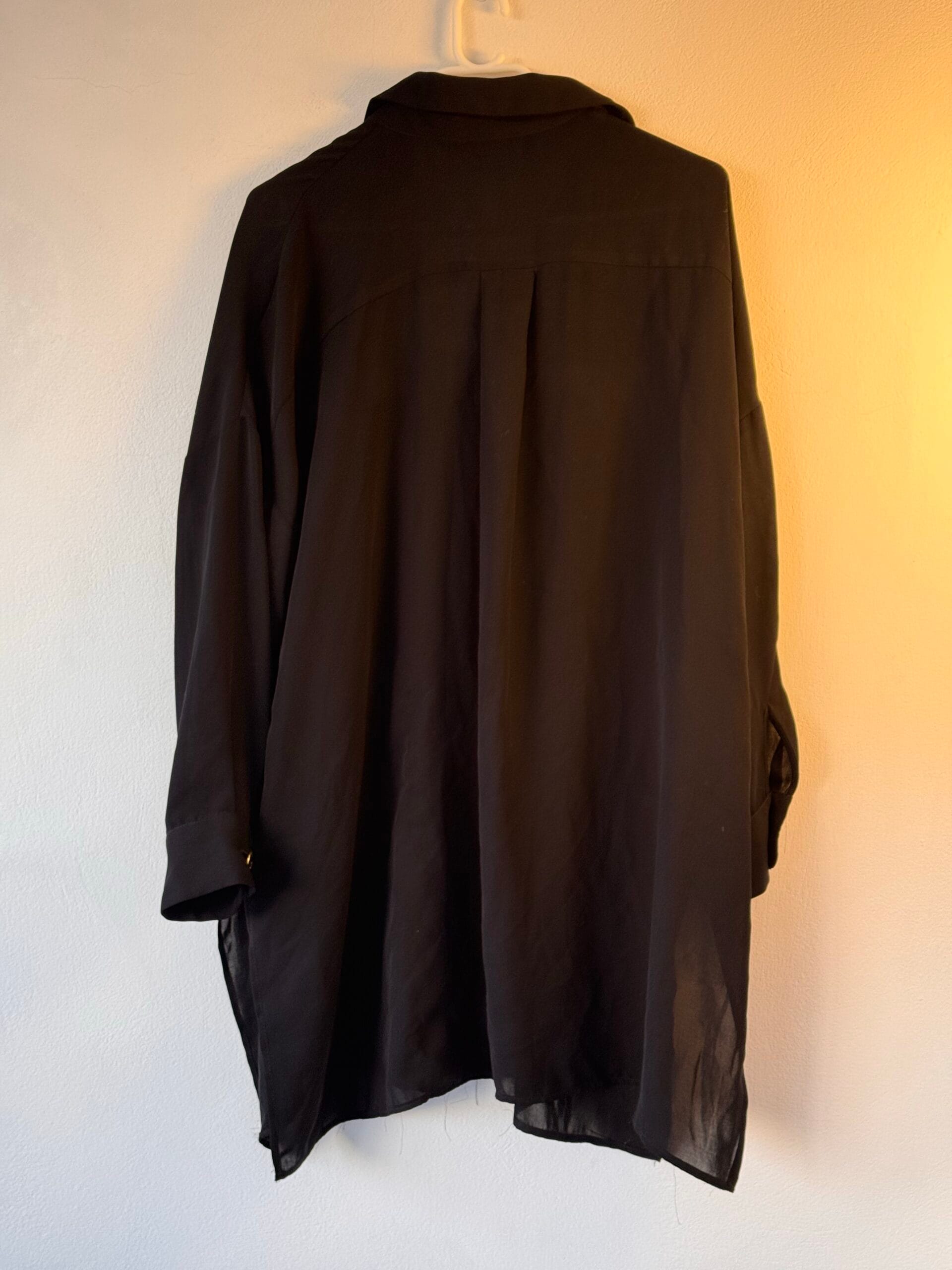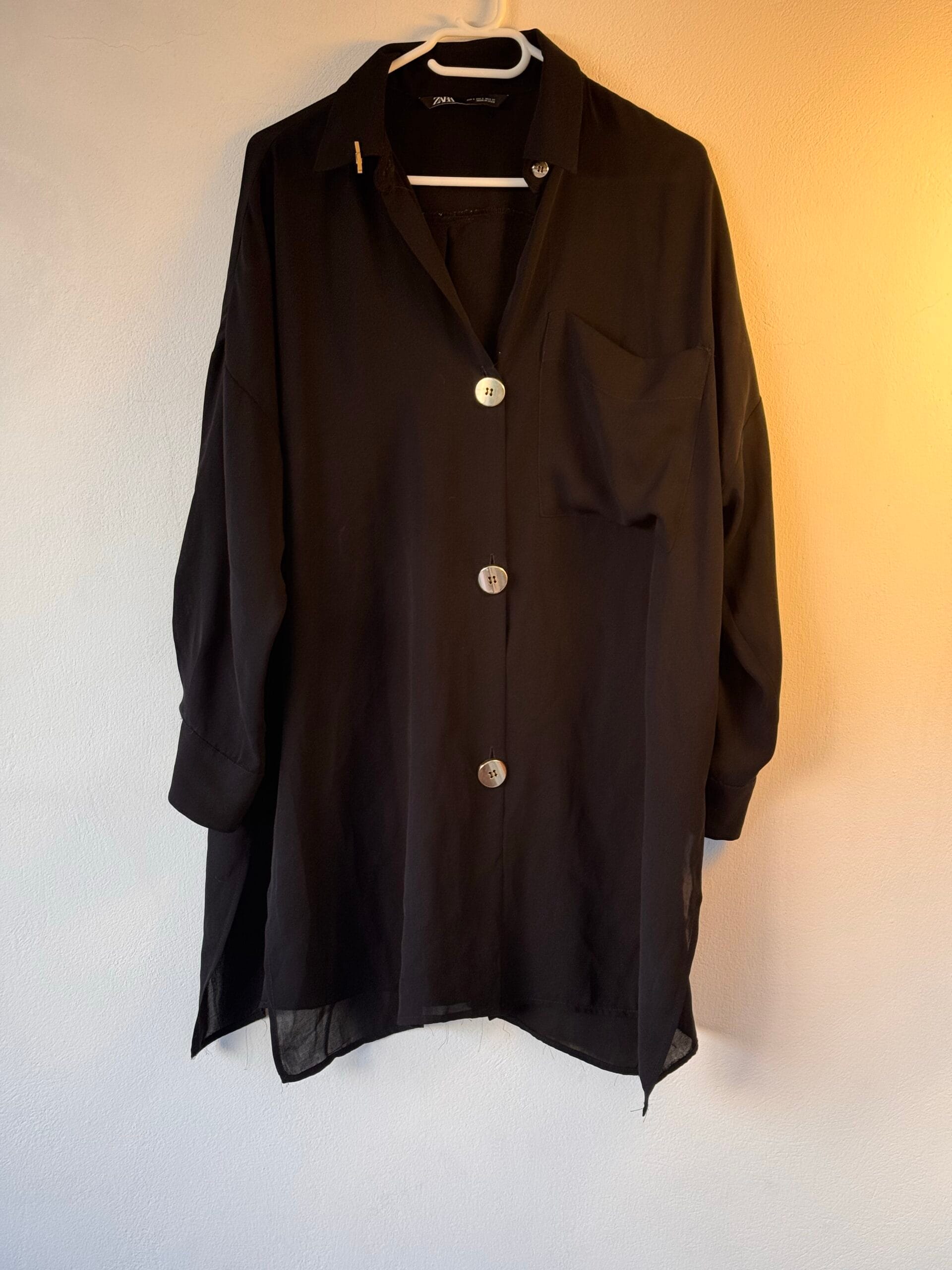 Κομψό μαύρο πουκάμισο από ZARA, σε ανάλαφρη σατέν υφή με διακριτική διαφάνεια στο τελείωμα. Κλασικός γιακάς, μπροστινό κλείσιμο με κουμπιά και χαλαρή γραμμή που πέφτει όμορφα στο σώμα χωρίς να κολλάει. Ένα ευέλικτο κομμάτι που φοριέται από το πρωί έως το βράδυ, τόσο σε επαγγελματικό όσο και σε πιο elegant casual styling. Συνδυάζεται ιδανικά με παντελόνια, φούστες αλλά και layered looks.