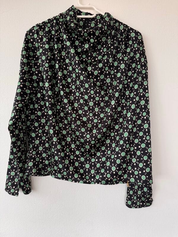 Εντυπωσιακή ZARA geometric satin μπλούζα σε retro black & green μοτίβο, ιδανική για chic εμφανίσεις από το πρωί μέχρι το βράδυ. Έχει σατέν υφή που «γράφει» υπέροχα στο φως, ψηλό neckline, μαλακό drape και λεπτεπίλεπτο τελείωμα στα μανίκια. Made in Portugal.