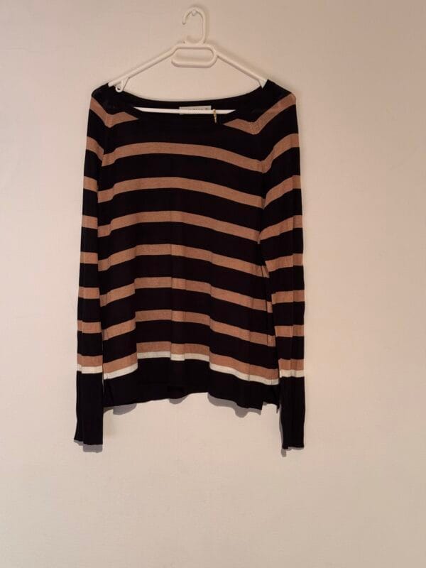 Ριγέ μπλούζα ZARA Knit σε κλασικό navy–camel χρωματικό συνδυασμό. Άνετη γραμμή, μαλακή υφή και ιδανικό μήκος για layering. Μέγεθος L.