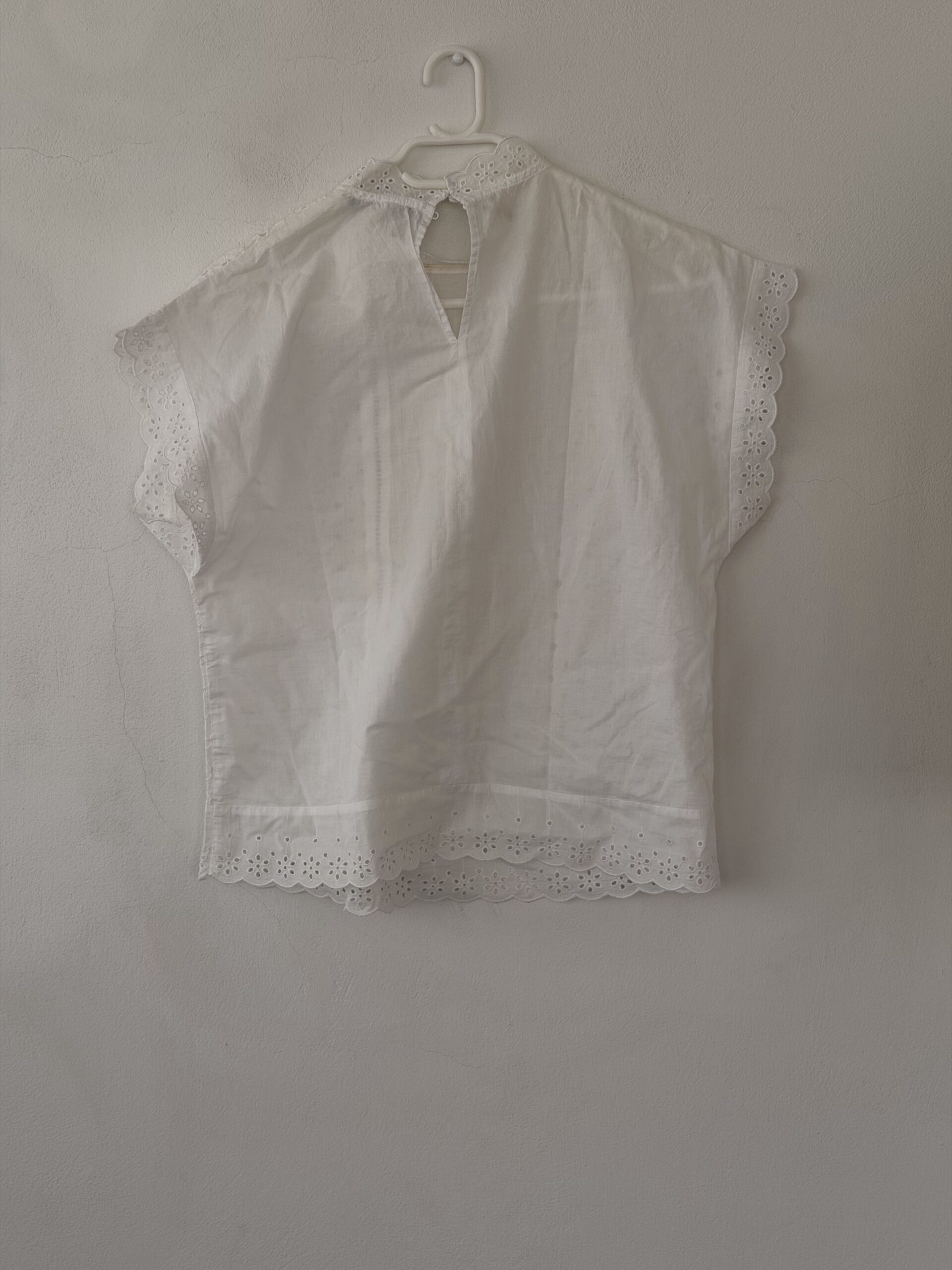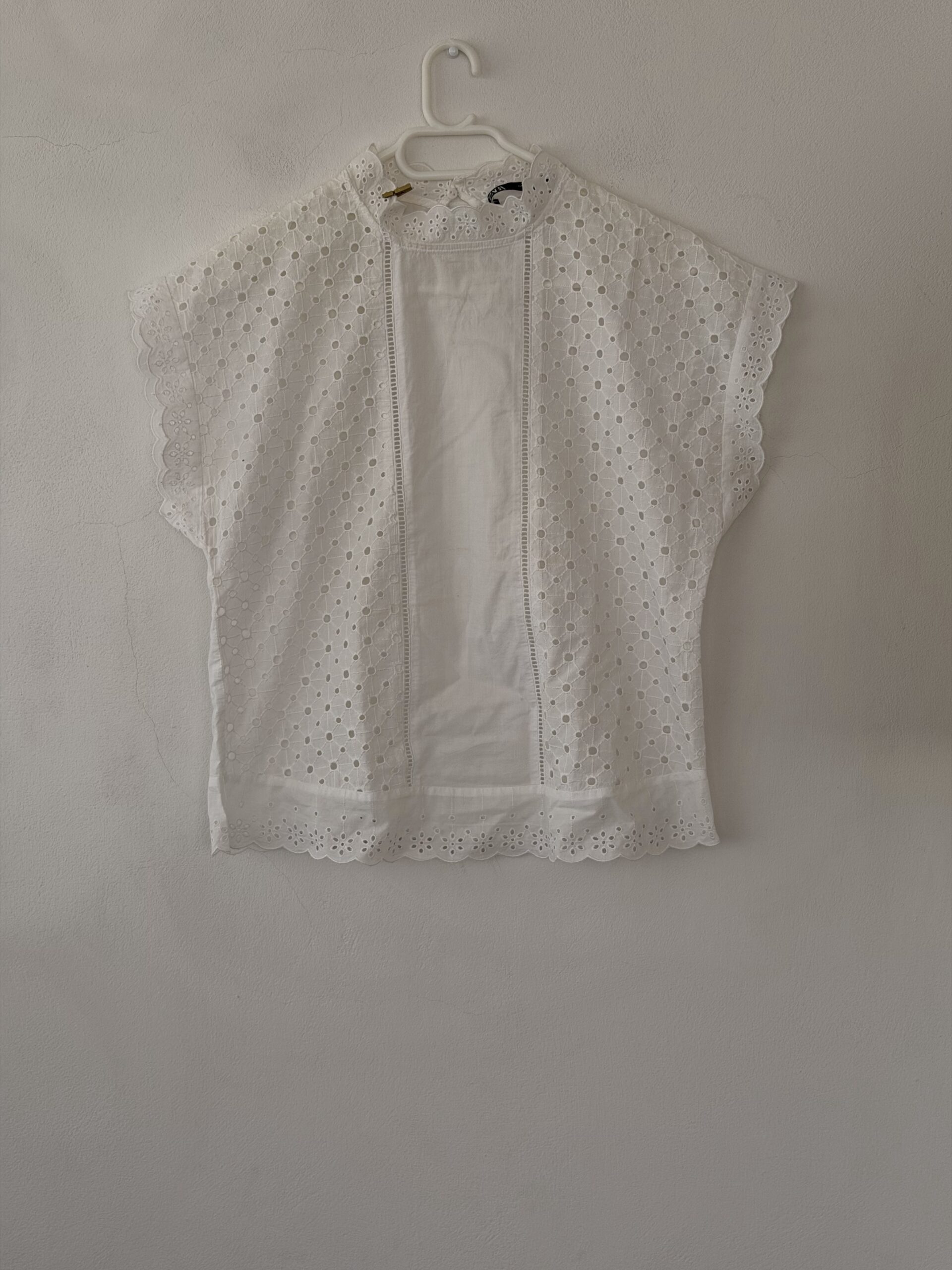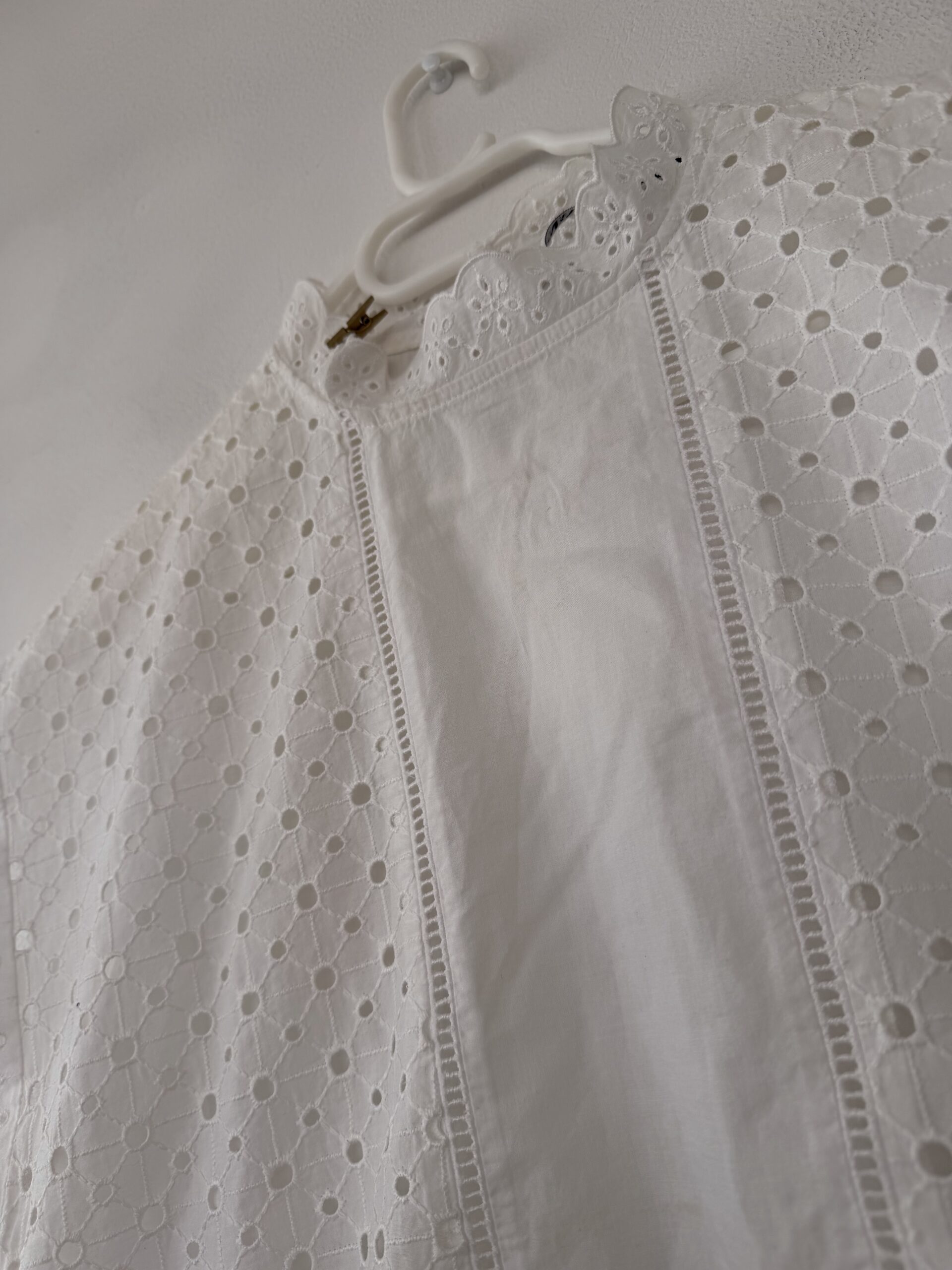 Αυτή η pre-loved broderie anglaise blouse από Zara συνδυάζει clean femininity με effortless καλοκαιρινό styling.