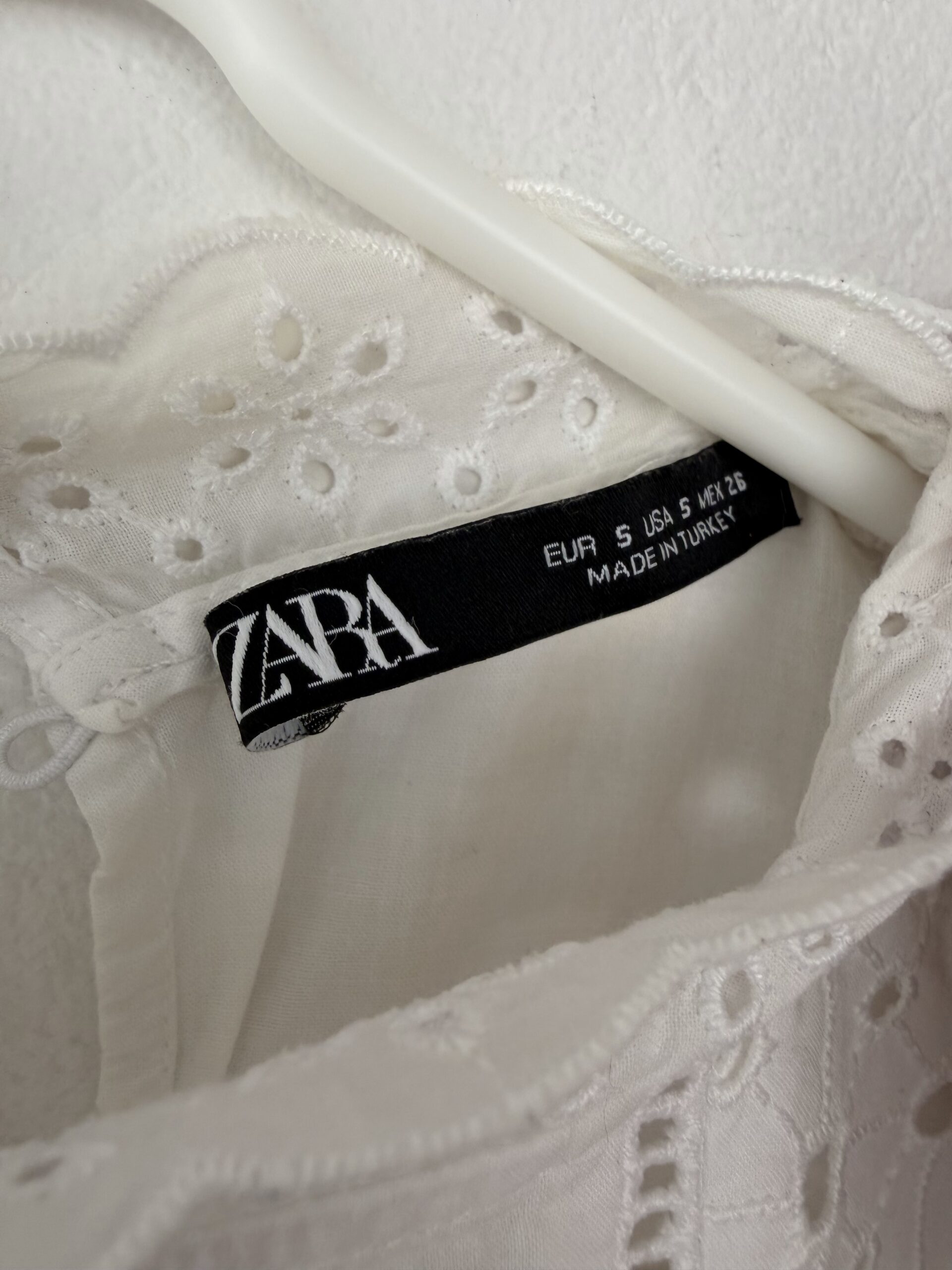 Λευκή broderie anglaise μπλούζα από Zara με ρομαντική λεπτομέρεια και αέρινη εφαρμογή. Το απόλυτο clean summer staple.