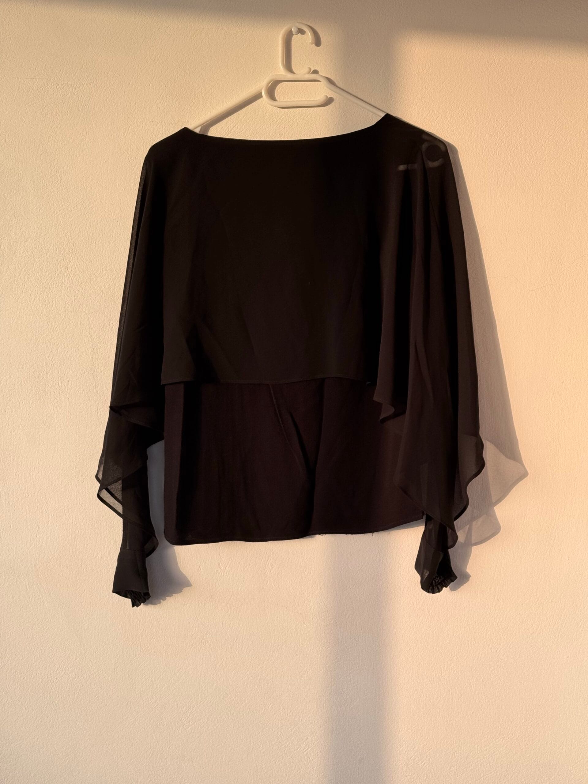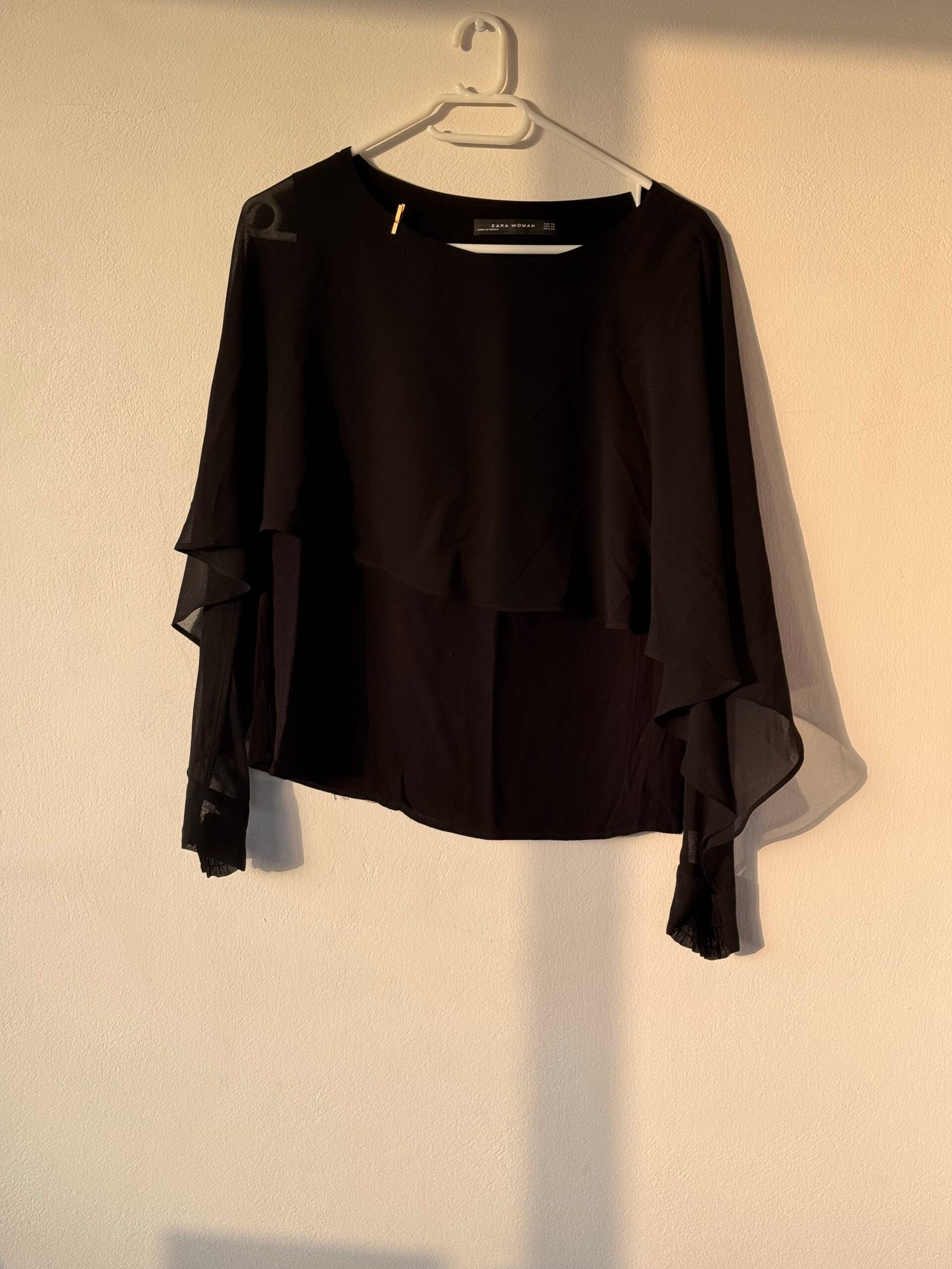 Κομψή μαύρη blouse από ZARA Woman, με minimal γραμμή και ιδιαίτερα διάφανα μανίκια που χαρίζουν κίνηση και θηλυκότητα. Η απαλή υφή και η καθαρή γραμμή την καθιστούν ιδανική τόσο για βραδινές εμφανίσεις όσο και για chic office looks. Φοριέται άνετα με παντελόνι ή φούστα και αναδεικνύει το πάνω μέρος του σώματος χωρίς υπερβολές. Διαχρονικό κομμάτι που δεν λείπει από καμία capsule γκαρνταρόμπα
